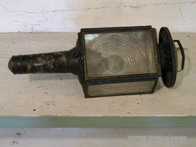 Metal lantern with molded tin back and two glass panels. The oil for the lantern sits in a low well, with a wick rising up into the main chamber. The back of the lantern is lined in tin that has been hammered in a circular design to reflect light. The front two panels are clear glass. The lantern has a short, metal chimney with a circular cap and upper handle.Context