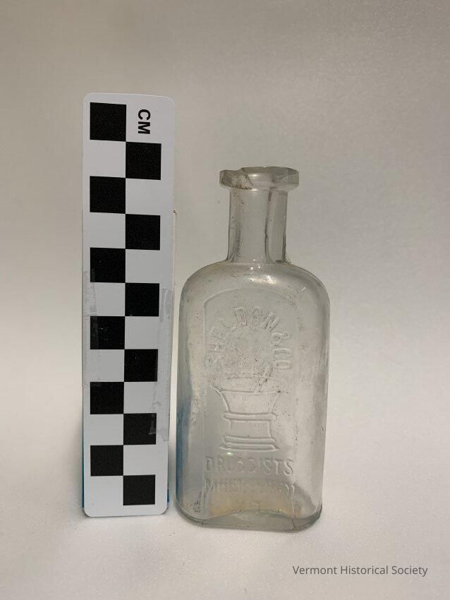 Clear, molded glass bottle with the molded inscription, "SHELDON & CO/DRUGGISTS/MIDDLEBURY/VT." and a mortar and pestle. A paper sticker bears the inked inscription, "4/26/71 / 50 / Srocker"
