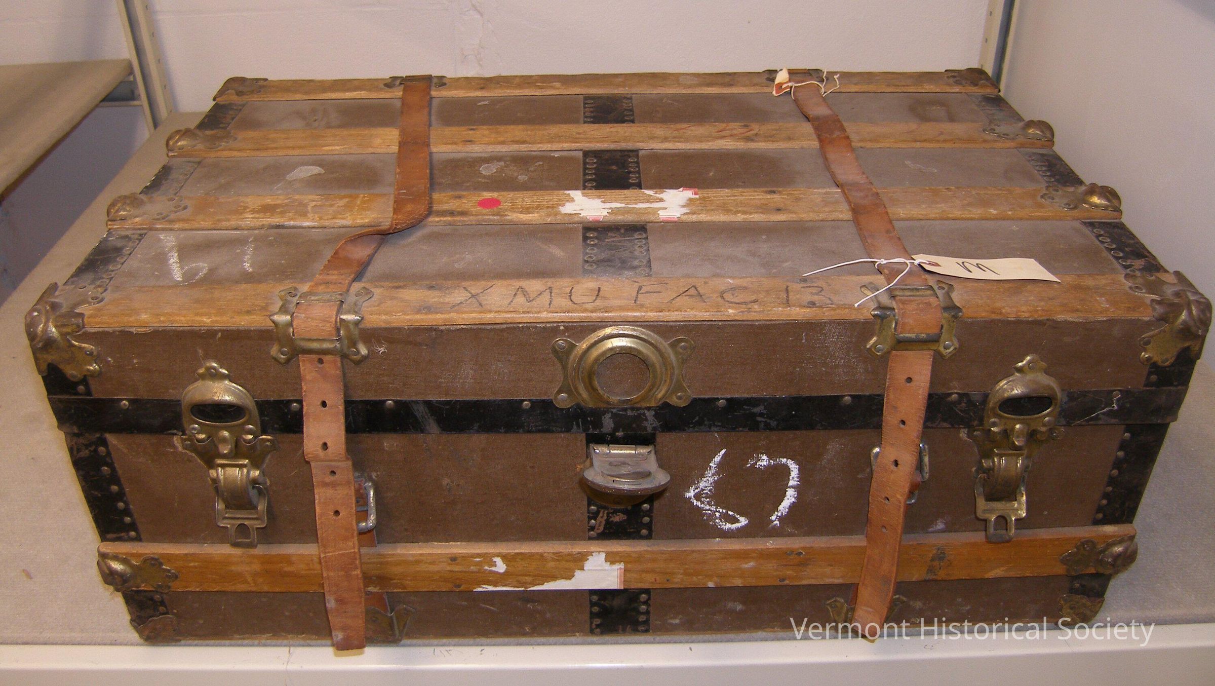 Steamer trunk. Label has M on it. Trunk has XMUFACI13 written on top, 87 in chalk on front. Newspapers inside.