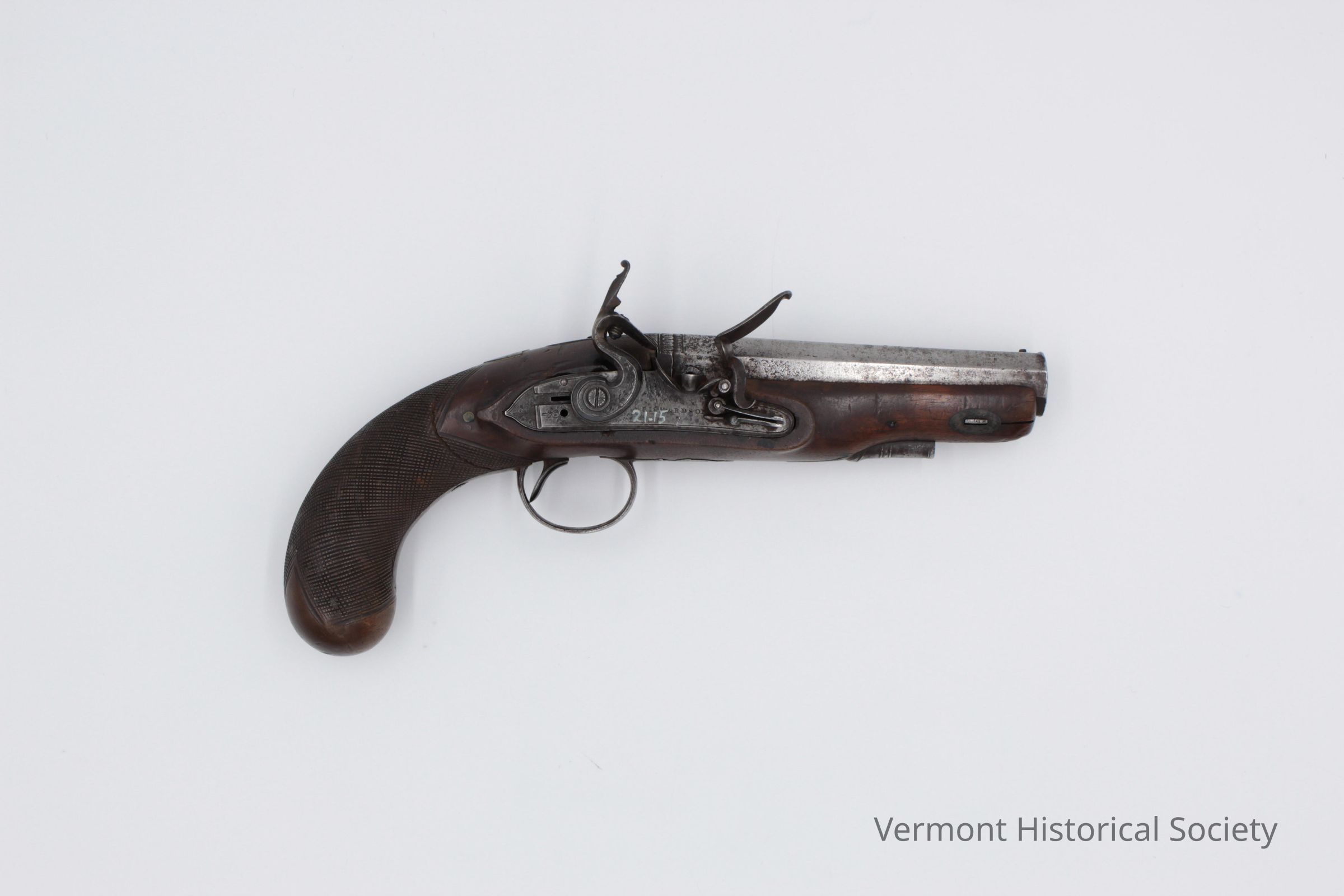 Small flintlock pistol. It is smoothbore with an octagonal barrel. The lock and barrel and both engraved with botanical elements. The metal grip is etched in a diamond pattern. The lock is marked, "Richardson" and "Manchester". The rack plate is marked, "N".