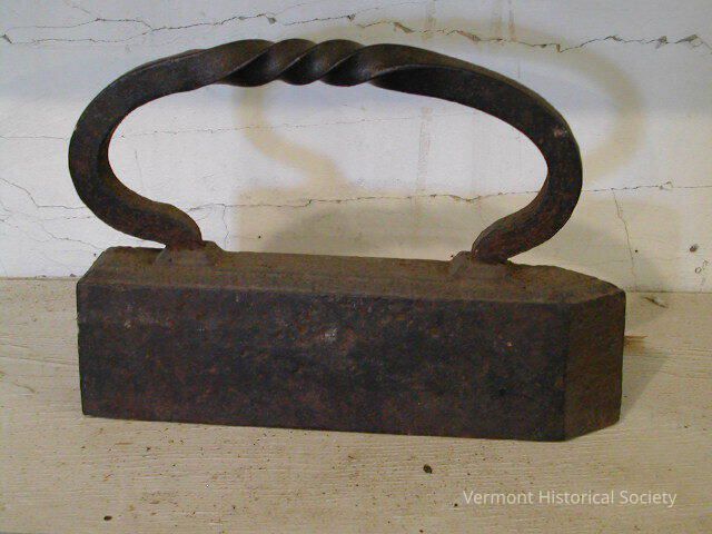 Heavy, narrow sad iron consisting of a tall base and twisted around handle.