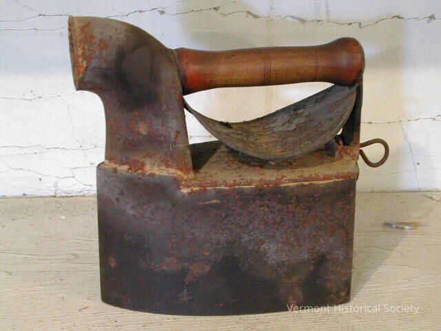 Hot coals are inserted through the rear opening, which heat water in the front chimney, causing steam. Used to remove wrinkles from fabric and clothing.Context