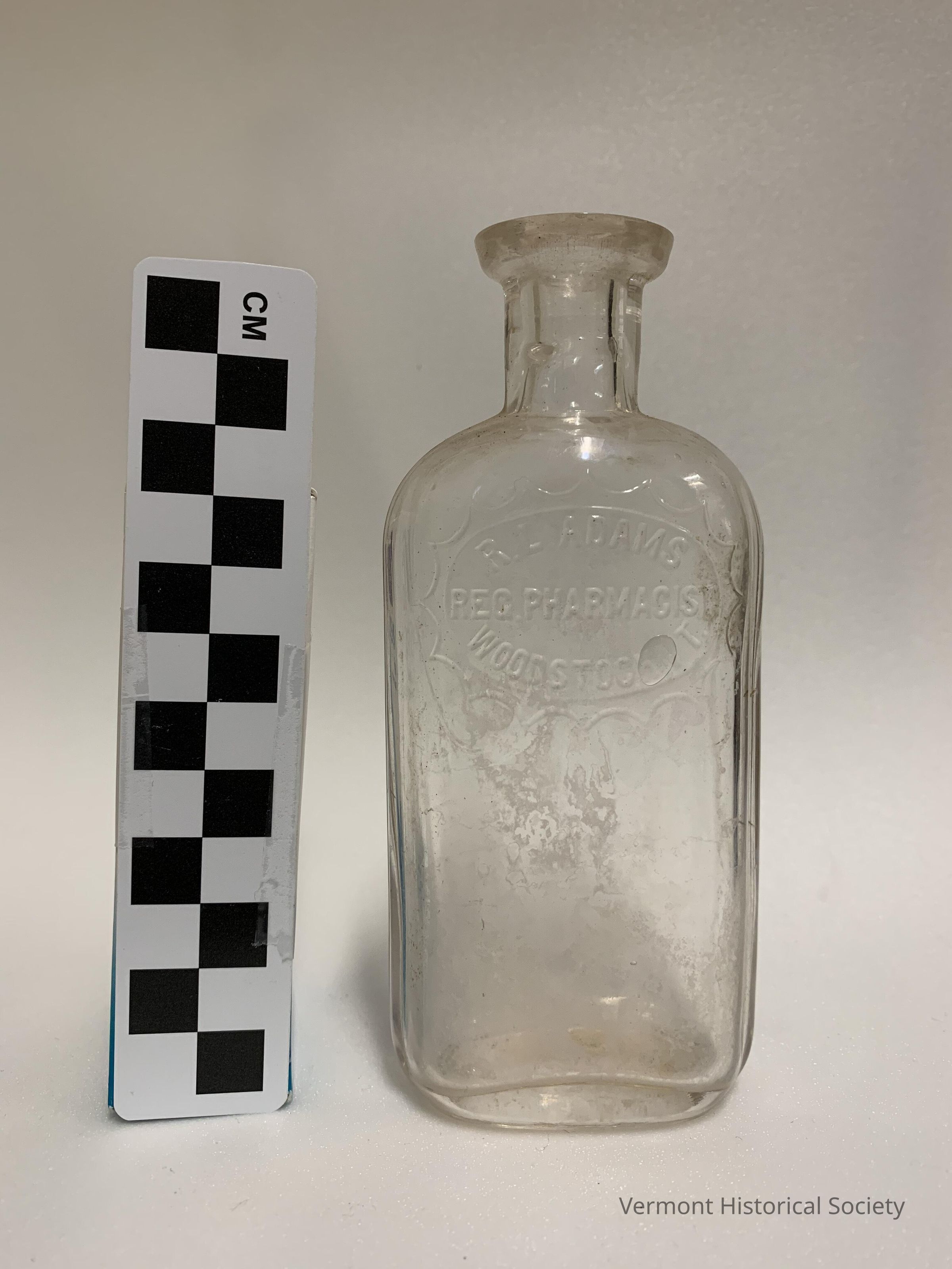 Clear, molded glass bottle with the molded inscription "R. L. ADAMS/REG. PHARMACIST/WOODSTOCK V. T." within an oval with an inward-facking scalloped border. A paper sticker on the base bears the inked inscription, "6/26/71 / Duan/Made/150".