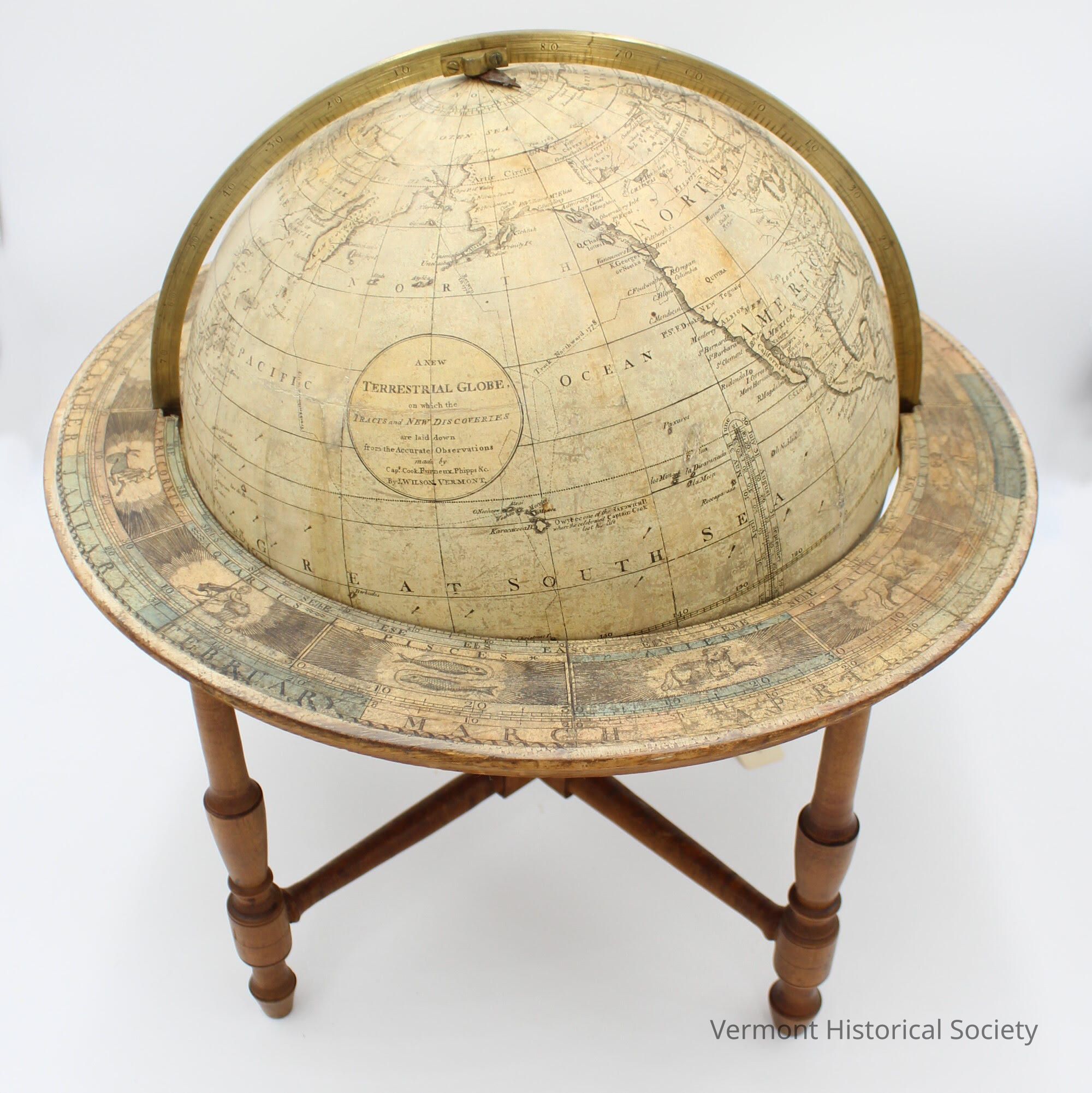 Wilson manufactured a variety of globes, including a line of papier-mache globes that he could produce and sell inexpensively. His globes were the first to be manufactured in America, and found a ready audience in schools in particular. This globe was not among his first run, but was produced later, in 1816. The Wilson Manufacturing Company continued to produce globes in Vermont and New York for nearly fifty years.