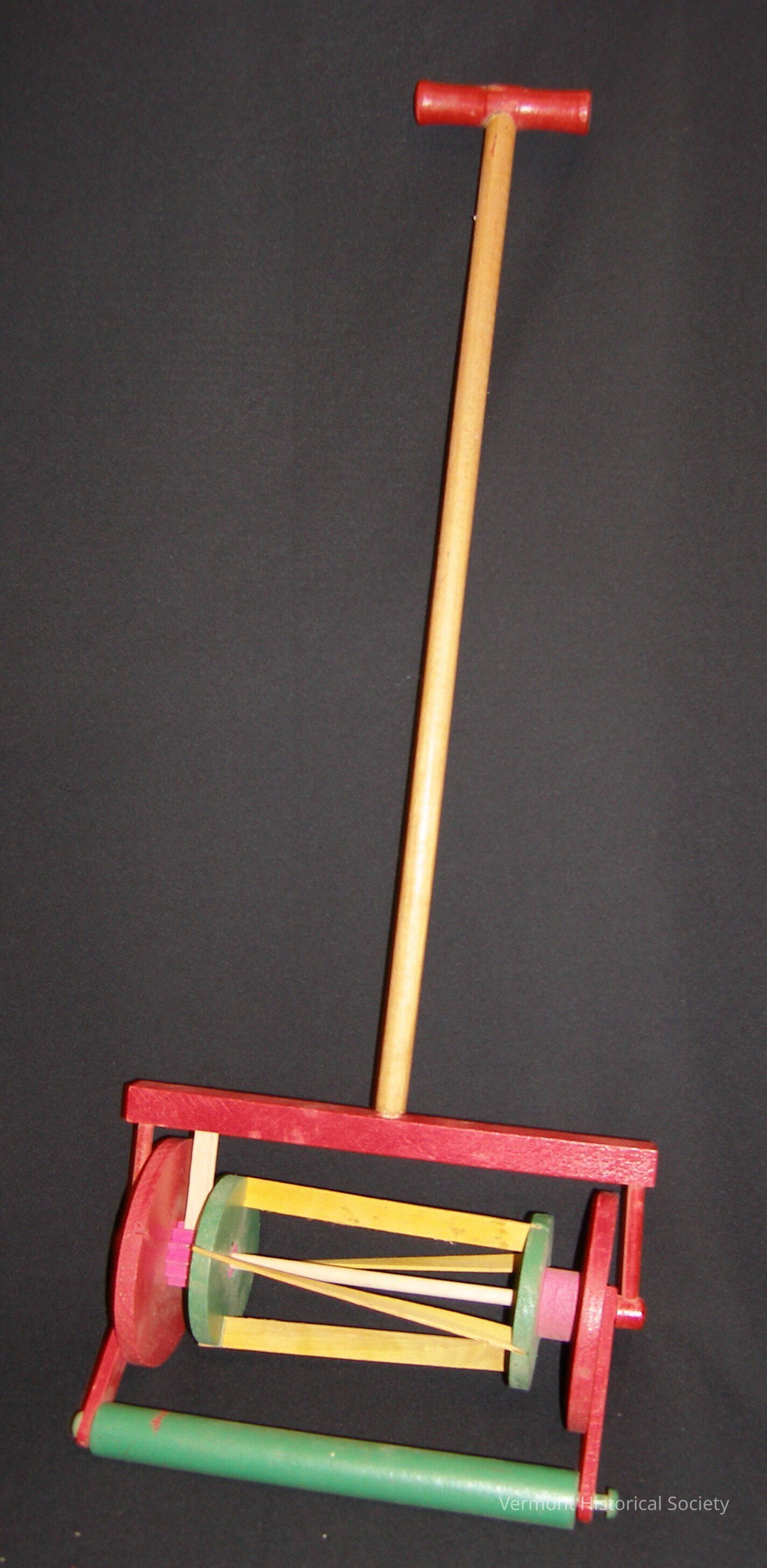 Wooden toy lawn mower painted in yellow, red, and green. The toy has a long handle with a rotating cylinder at the bottom that turns when the object is pushed along the ground. There is a thin, rectangular piece of a wood that overlaps with the tines of a gear to create a "clacking" noise as the cylinder turns.