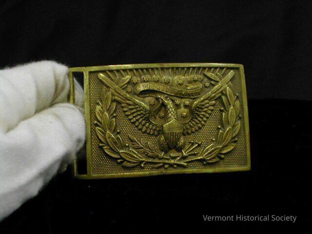 Rectangular brass belt buckle molded with an image of a spread eagle with a federal shield on its chest. Is it framed by a silver-plated laurel wreath. There is a rectangular extension on the proper right side of the buckle.