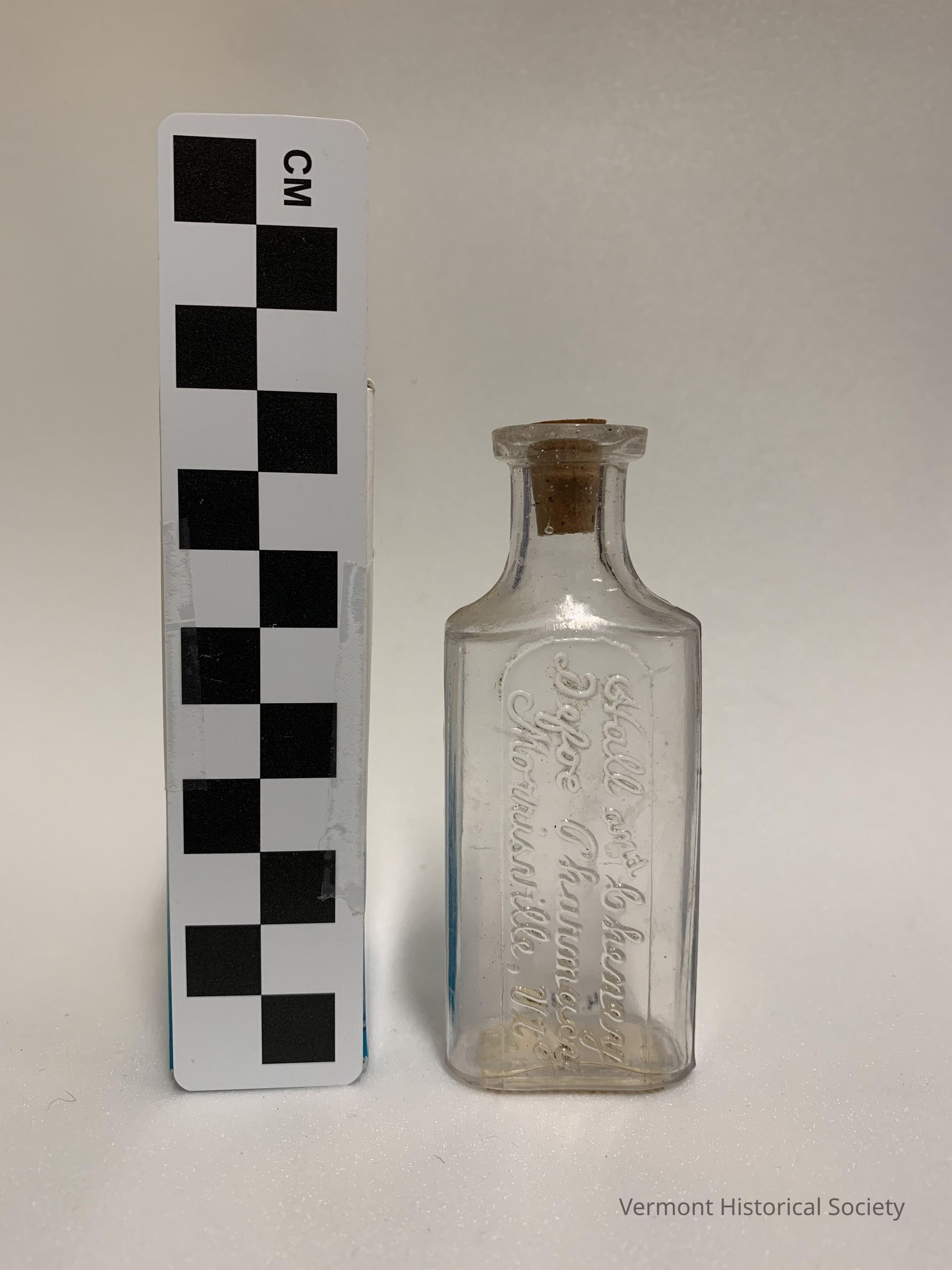 Clear, molded glass bottle bearing the molded inscription "Hall and Cheney/Defoe Pharmacy/Morrisville, Vt." in cursive. A paper sticker on the base bears the inked inscription, "5/10/71 / Lepine Morrisville / 150". The sticker completely obscures the molded inscription on the base of the bottle, but the letters "U.S.A. is visible through the body of the glass. The cork stopper is still present.