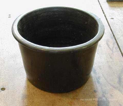 Redware crock. The vessel has straight sides that flair outward toward the top and a thick, round lip.