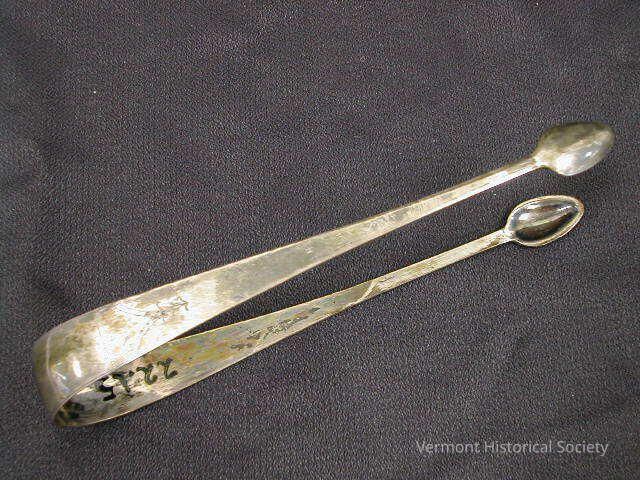 Silver sugar tongs. The grips are oval, and the hand is engraved with the initials "SB".