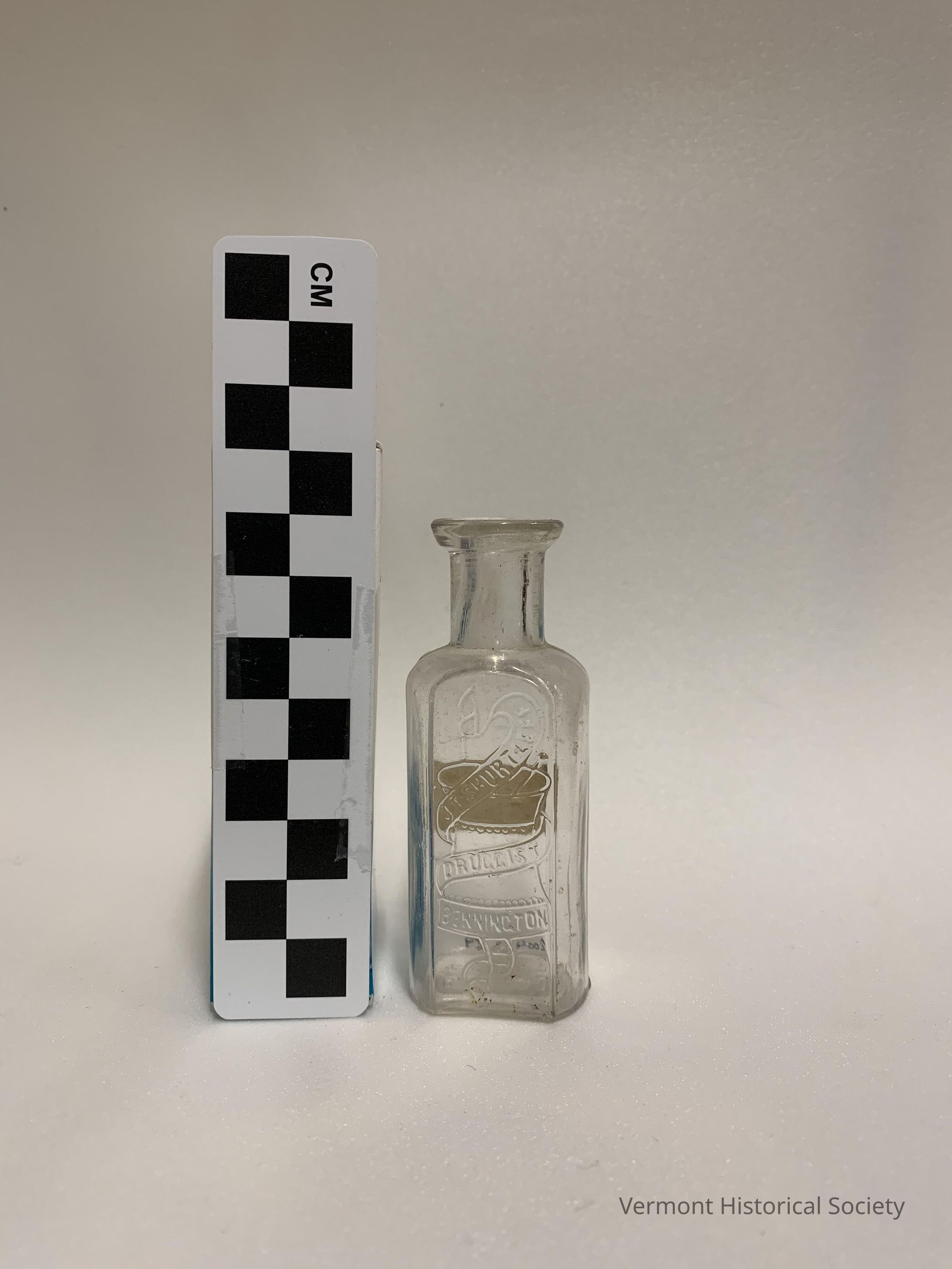 Small, clear, molded glass bottle bearing the molded inscription, "J. T. SHURTLEFF/DRUGGIST/BENNINGTON, VT." within a ribbon wrapping around a mortar and pestle. The base bears the molded inscription, "B. B. & Co./PAT'D". A fabric sticker on the reverse bears the penciled inscription, "$3.55 B".Acquisition