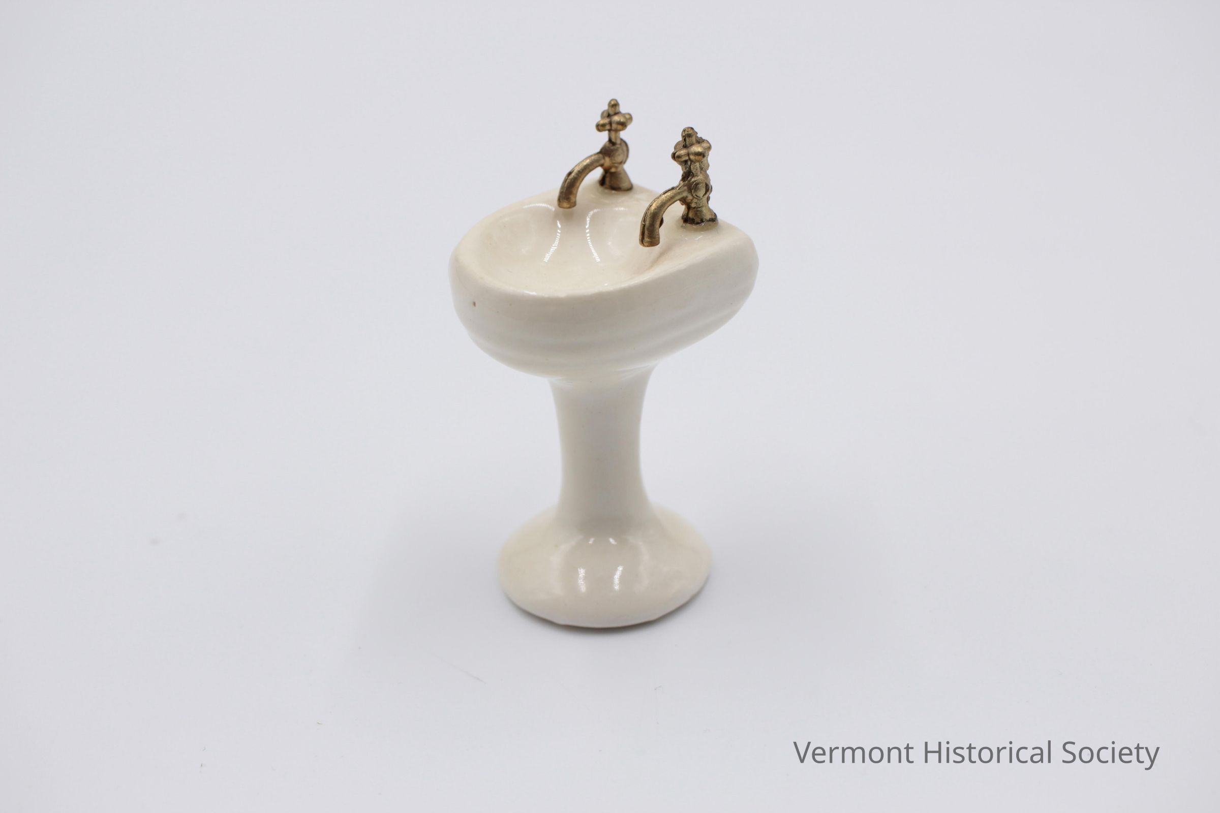 Miniature ceramic pedestal sink with gold-toned metal faucets. A small gold sticker on the bottom reads, "Made in Taiwan".Context