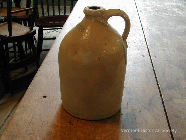 Stoneware jug with large handle at the back of the opening. The center front is stamped with the label, "JULIUS NORTON BENNINGTON VT."Context