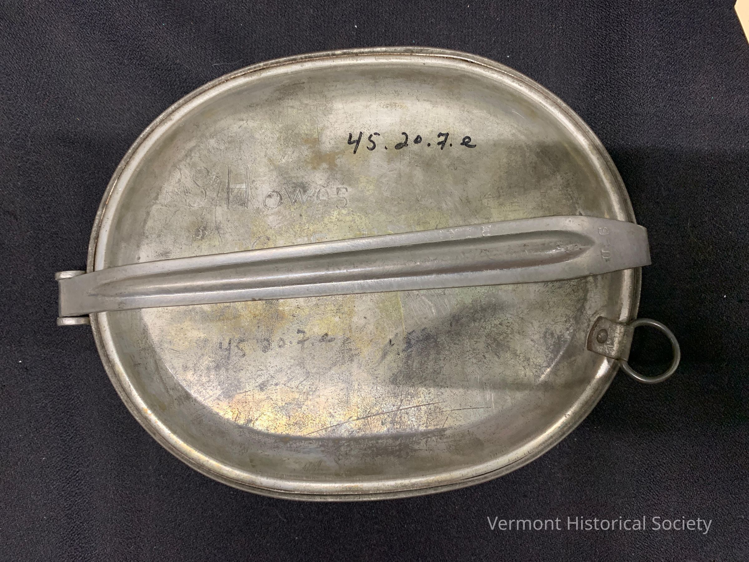 Mess kit plate/pan. The piece consists of two oval bowls that fit together, one of which has a long handle that folds over the other bowl to hold everything together. The outside of one of the bowls is scratched with the inscription, "S. Howes Co F 1sT VT".Context