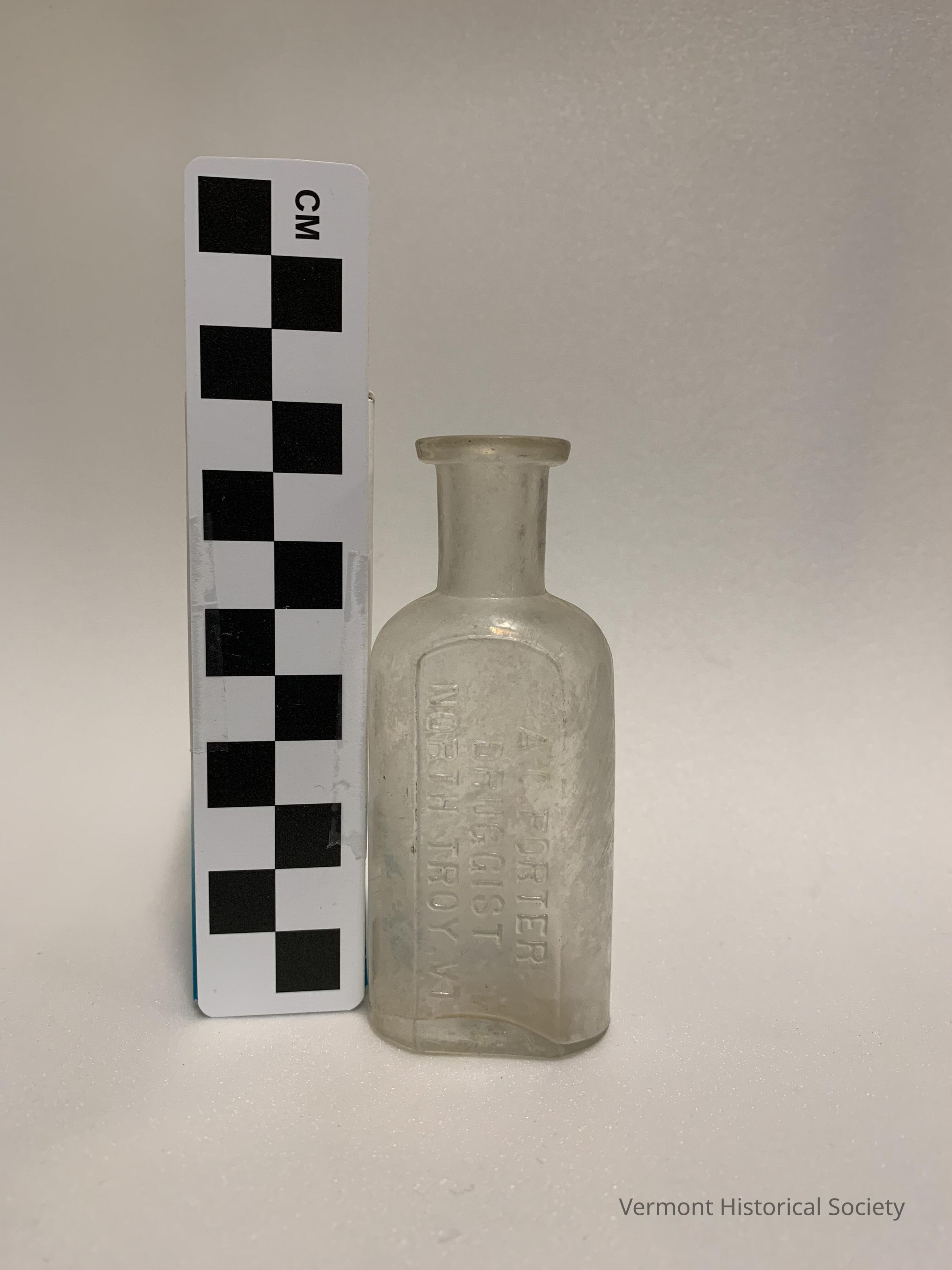 Small, clear, molded glass bottle bearing the molded inscription, "A. C. PORTER/DRUGGIST/NORTH TROY, VT". A paper sticker on the base bears the inked inscription, "5/10/71 / Lepine / 150".