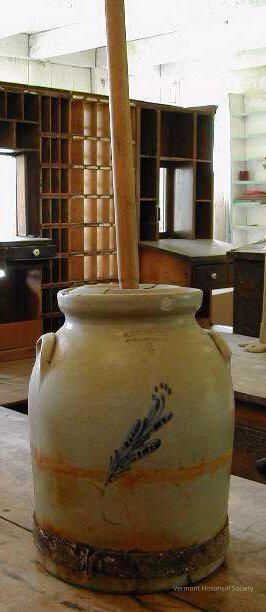 Stoneware butter churn with blue hand-painted design of a stem of wheat. There is a flat iron band around the bottom of the churn. Two U-shaped handles are applied on either side. At the center front is the stamped inscription, "F. WOODWORTH / BURLINGTON, VT / 4". The churn has a small lid with a hole in the center, through which a long wood rod with a paddle on the end is inserted.Context