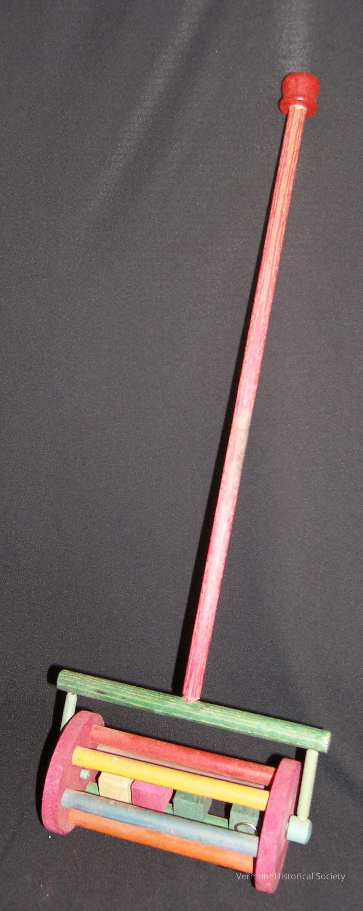 Wooden toy lawnmower painted yellow, pink, green, blue, and orange. The toy has a long red handle with a rotating cylinder at the bottom. The cylinder is filled with multi-colored wooden blocks.