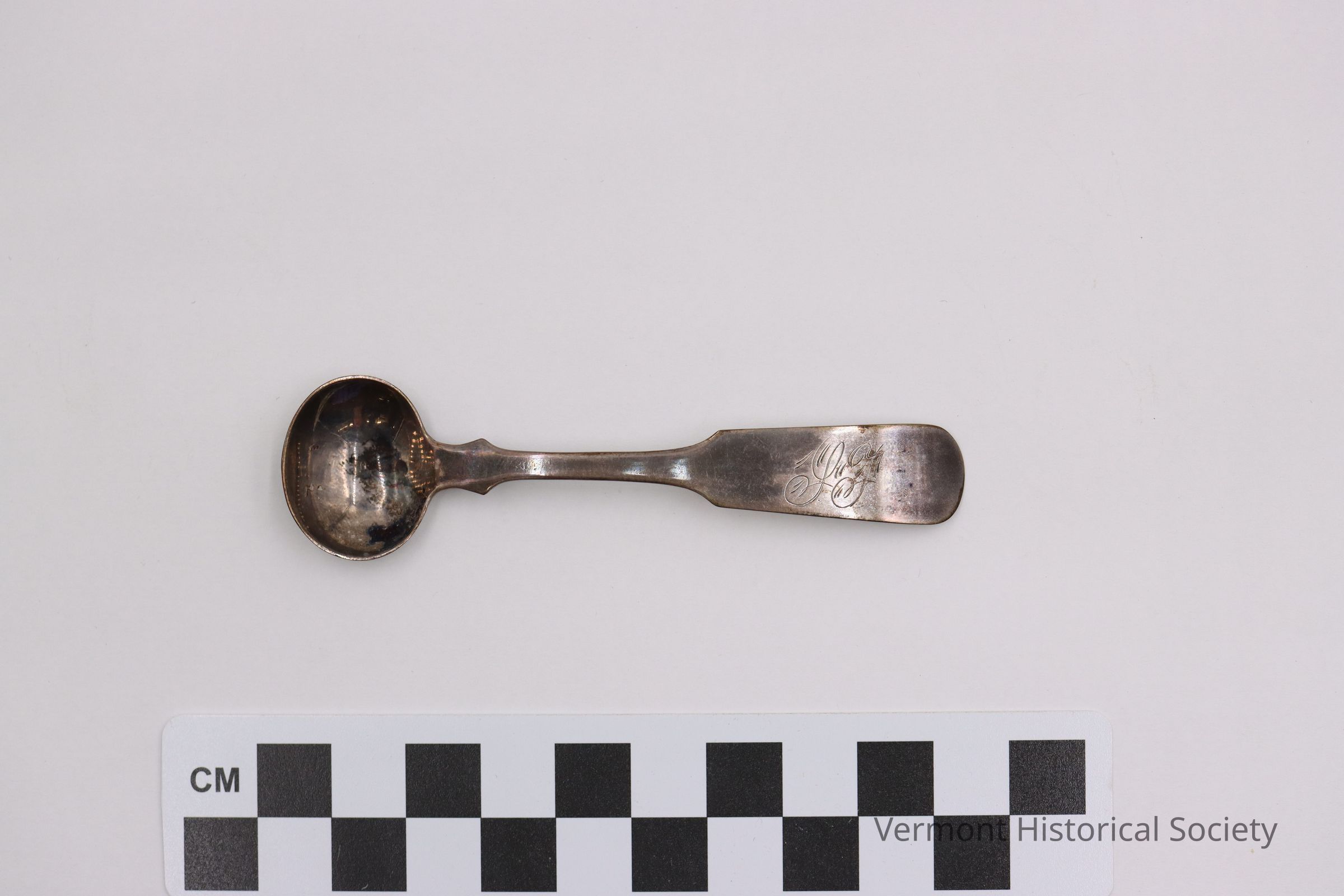 One of a pair of small salt spoons engraved with the initials "ST". The back of the handle is stamped with the mark, "Jones, Lows & Ball." within a rectangle.