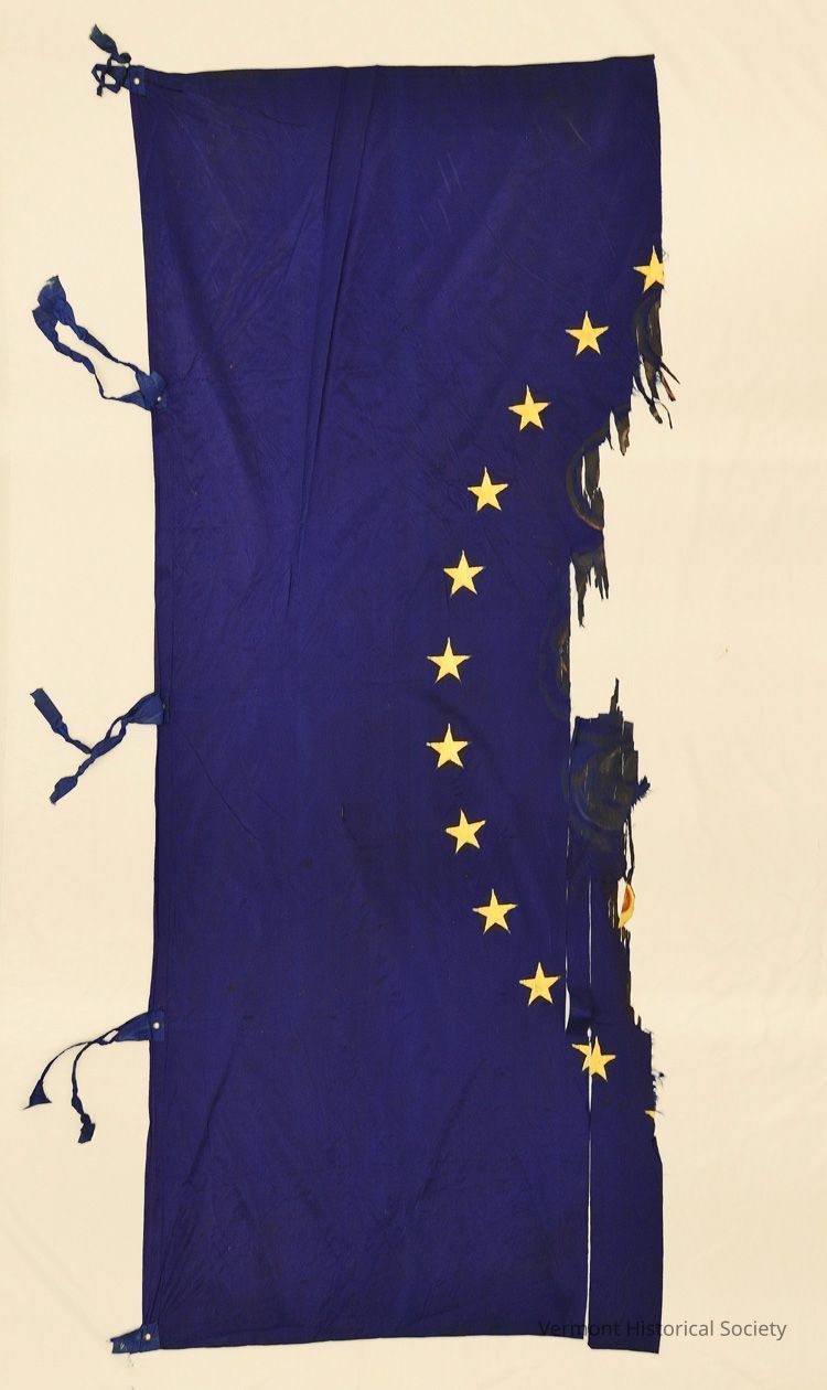 9th Vermont Infantry regimental flag. Fragment, most of flag is gone. Attached to staff by ties, which attached by grommets. 11 gold painted stars remain, which were once arranged in a large circle, 4.5 inches on center. Flag is a rich blue color.Made/Created