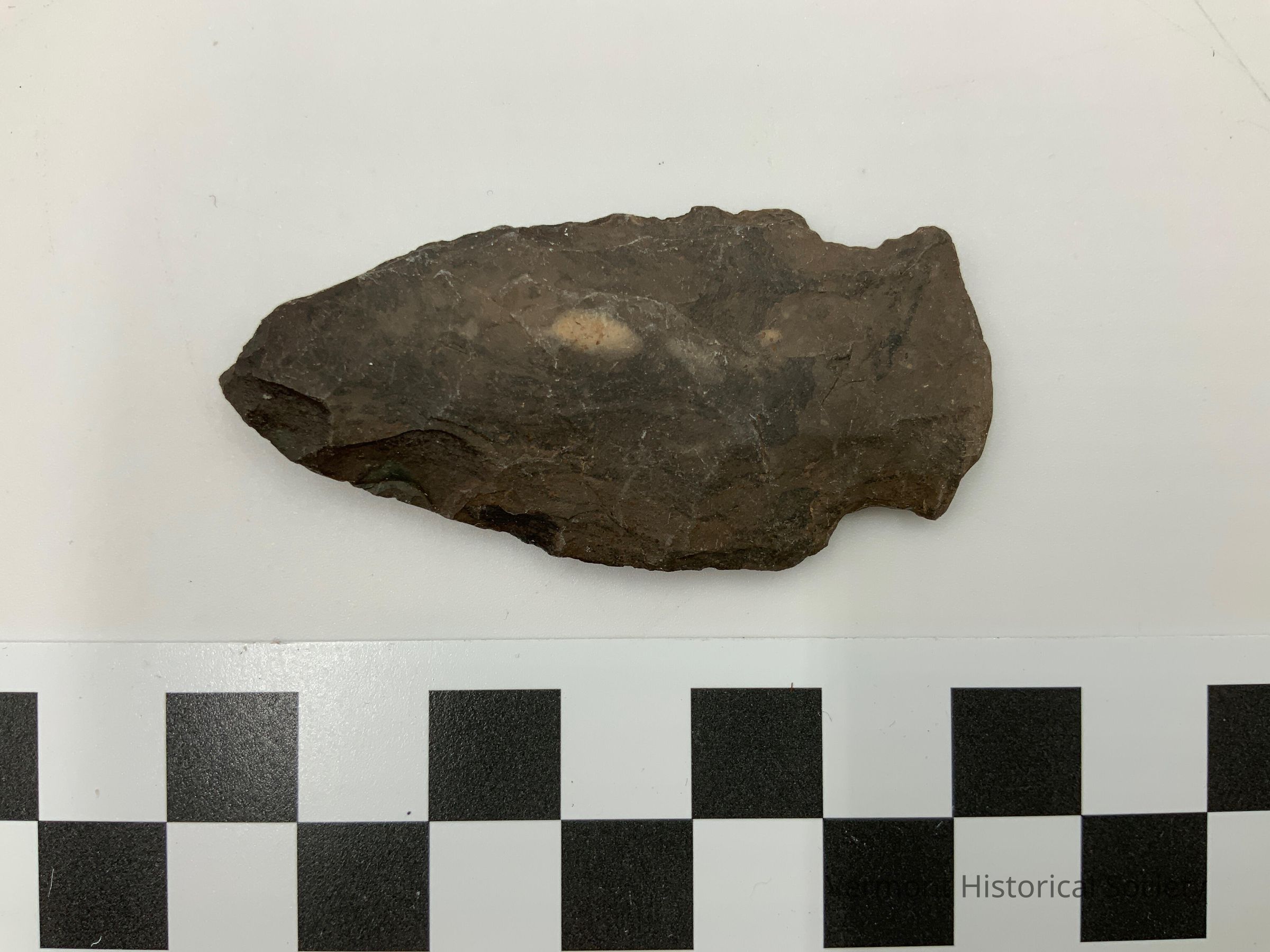 Dark brown chipped stone projectile point made of slate. It has corner notches and is asymmetrical. The blade edges curve outward.
