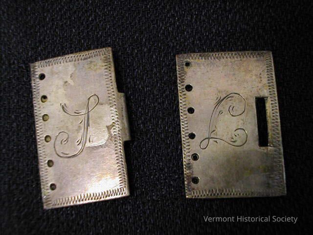 Silver belt consisting of two rectangular sides, one with a tab and one with a slot. The outer edge of each has 6 circular holes for attaching the belt. They are decoratively engraved with the initials "ST" (the T is pictured upside down).