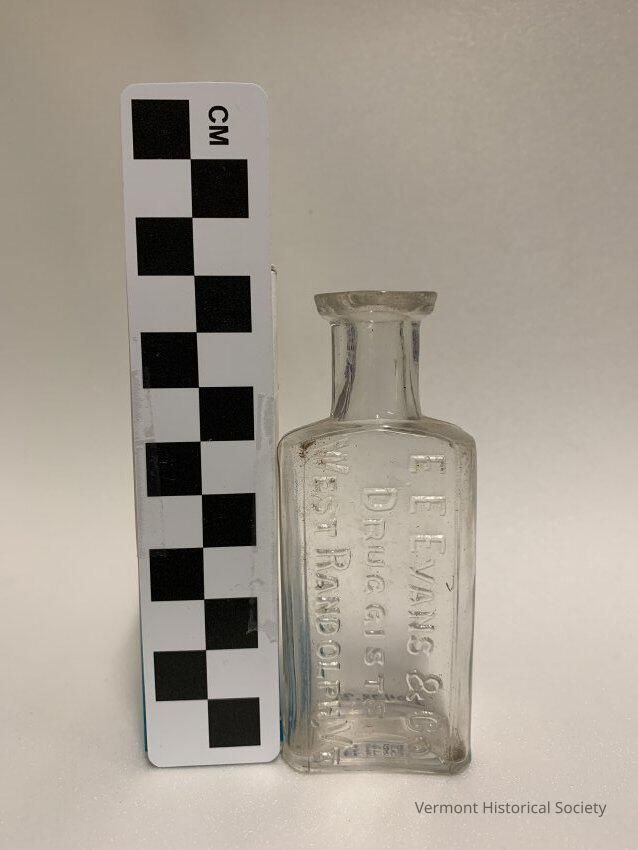 Small, clear molded glass bottle bearing the molded inscription, "E. E. EVANS & CO./DRUGGISTS/WEST RANDOLPH, VT." The base bears the molded inscription, "F F & W."