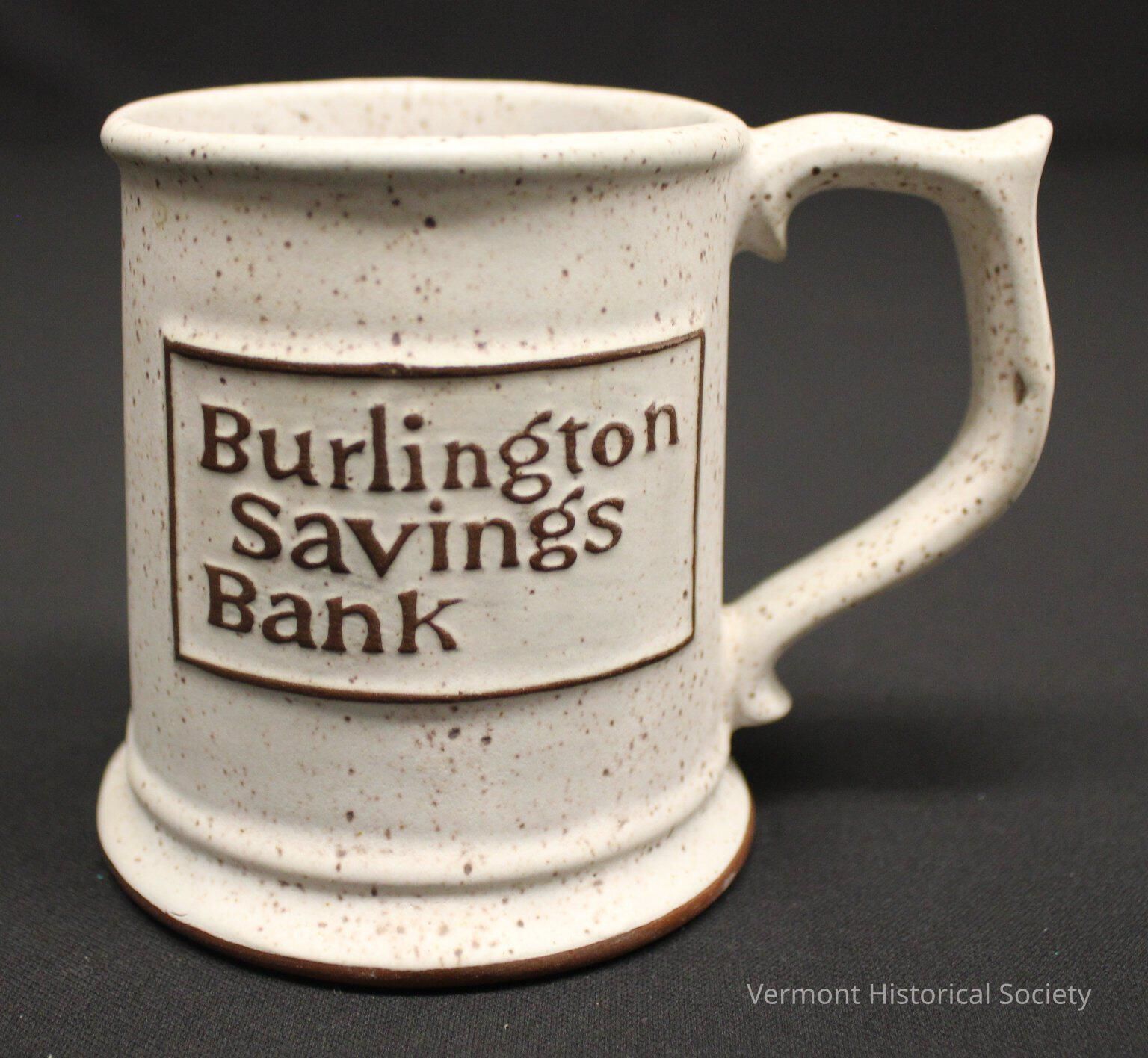 Stein-shaped mug with brown-speckled white glaze. One side is molded with the words, "Burlington Savings Bank", within a rectangle, and the raised letters and frame are painted brown. The molded base is also painted with a line of brown. The bottom of the mug is unglazed, showing the red/brown ceramic body and is stamped with the maker's mark, "goss Vermont".Context