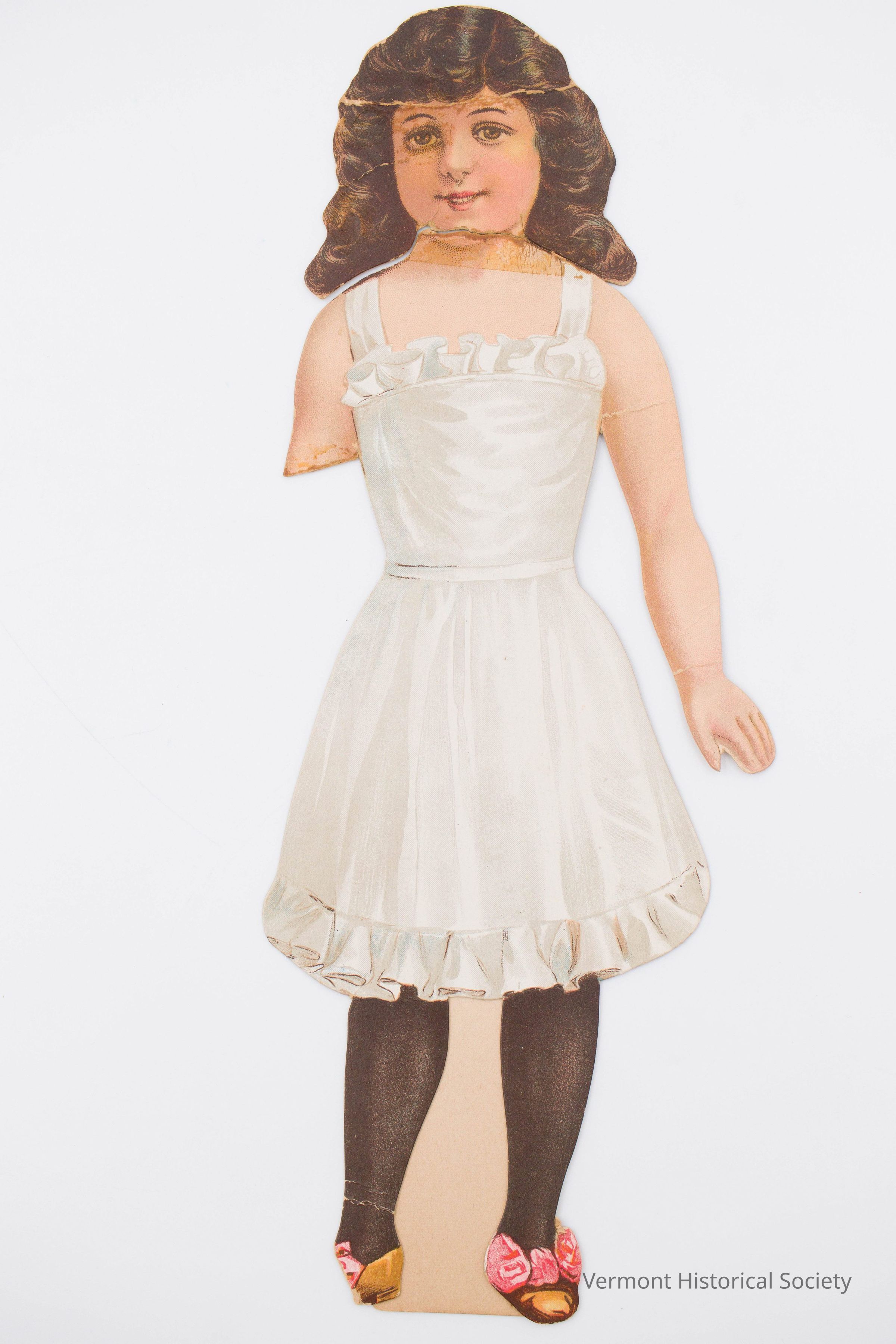 Large, paperboard doll. The doll is wearing white undergarments consisting of a drop-waist chemise and black stockings. She is also wearing brown shoes with pink bows. The doll's right arm is missing, and its head is detached.Context