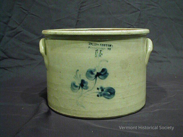 Straight-sided crock with hand-painted design of three clovers or flowers. There are two U-shaped handles on either side. The rim is rolled outward to create a lip. At the top center is the stamped label, "JULIUS FENTON BENNINGTON VT 1 1/2". There is a round lid with dark brown glaze in the center that nestles into the rim of the crock.Context