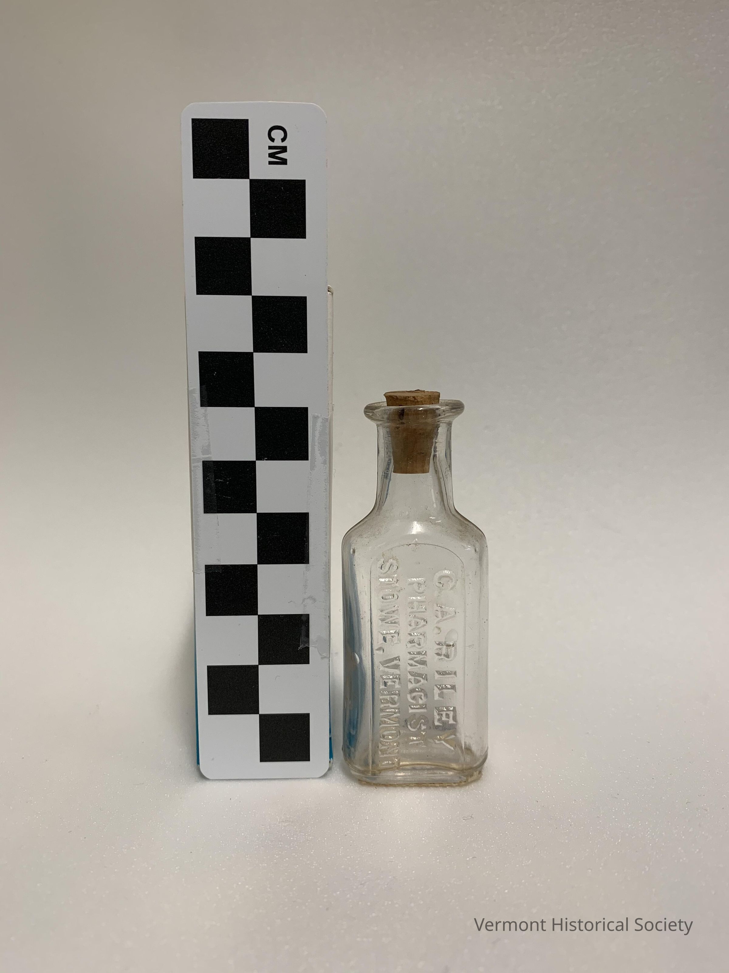 Small, clear molded glass bottle bearing the inscription "C. A. RILEY/PHARMACIST/STOWE, VERMONT." A paper sticker on the base bears the inked inscription, "5/10/71 / Lepine & Morrisville / 150".