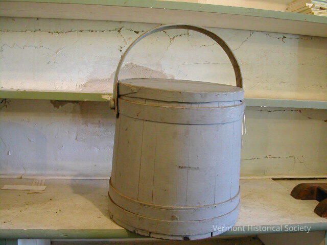 White-painted wooden firkin. The firkin is made of narrow wooden board held together with metal straps. There is a U-shaped metal handle.