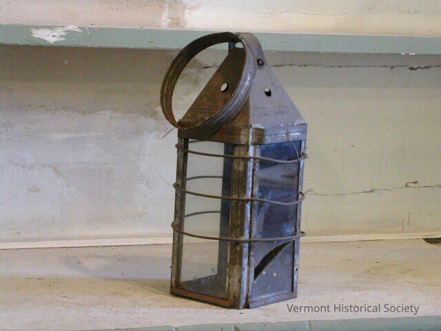 Tin lantern with three glass sides. The sides are wrapped with heavy-gauge metal wire. There is a round tin handle at the top.