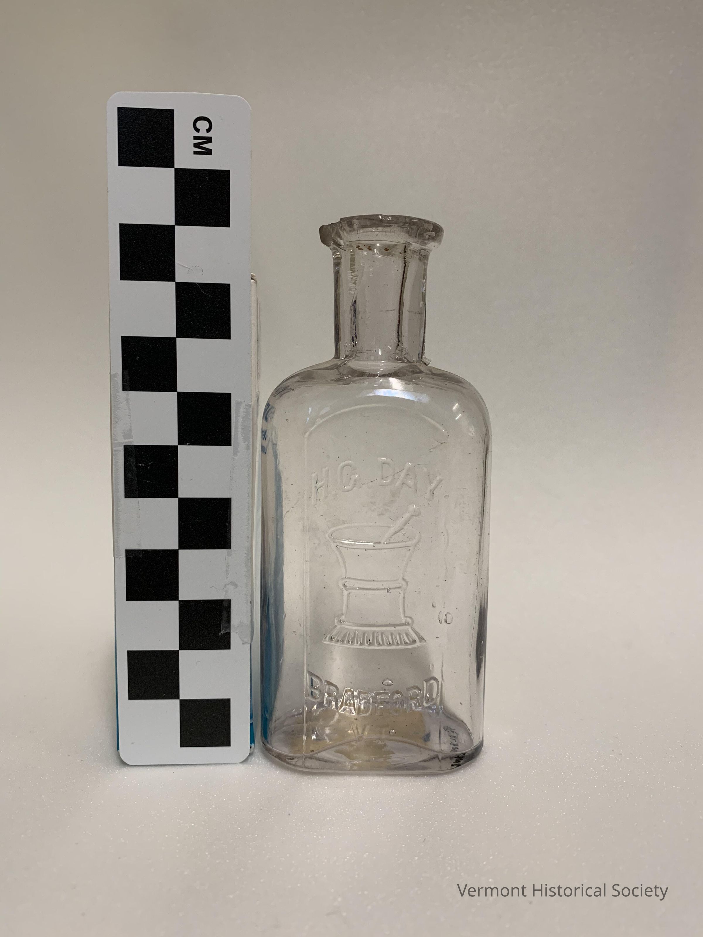 Clear, molded glass bottle bearing the molded inscription, "H. G. DAY/BRADFORD/VT." with an image of a mortar and pestle. A paper sticker on the base bears the inked inscription, "4/26/71 / 50 / Srocker".
