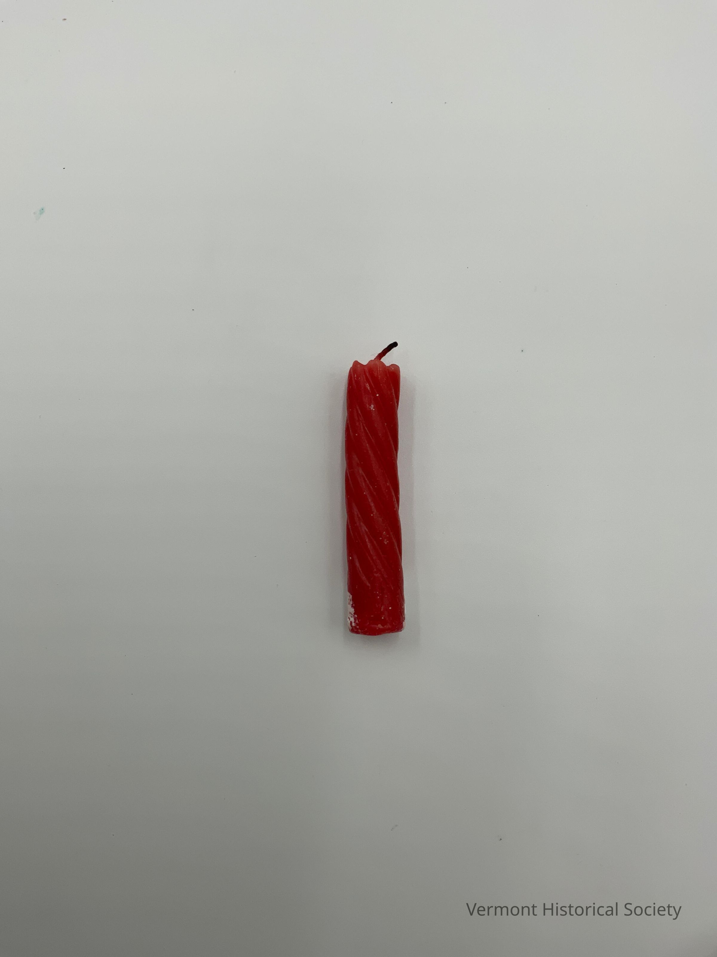 Partially burnt red wax candle molded with a swirled design.