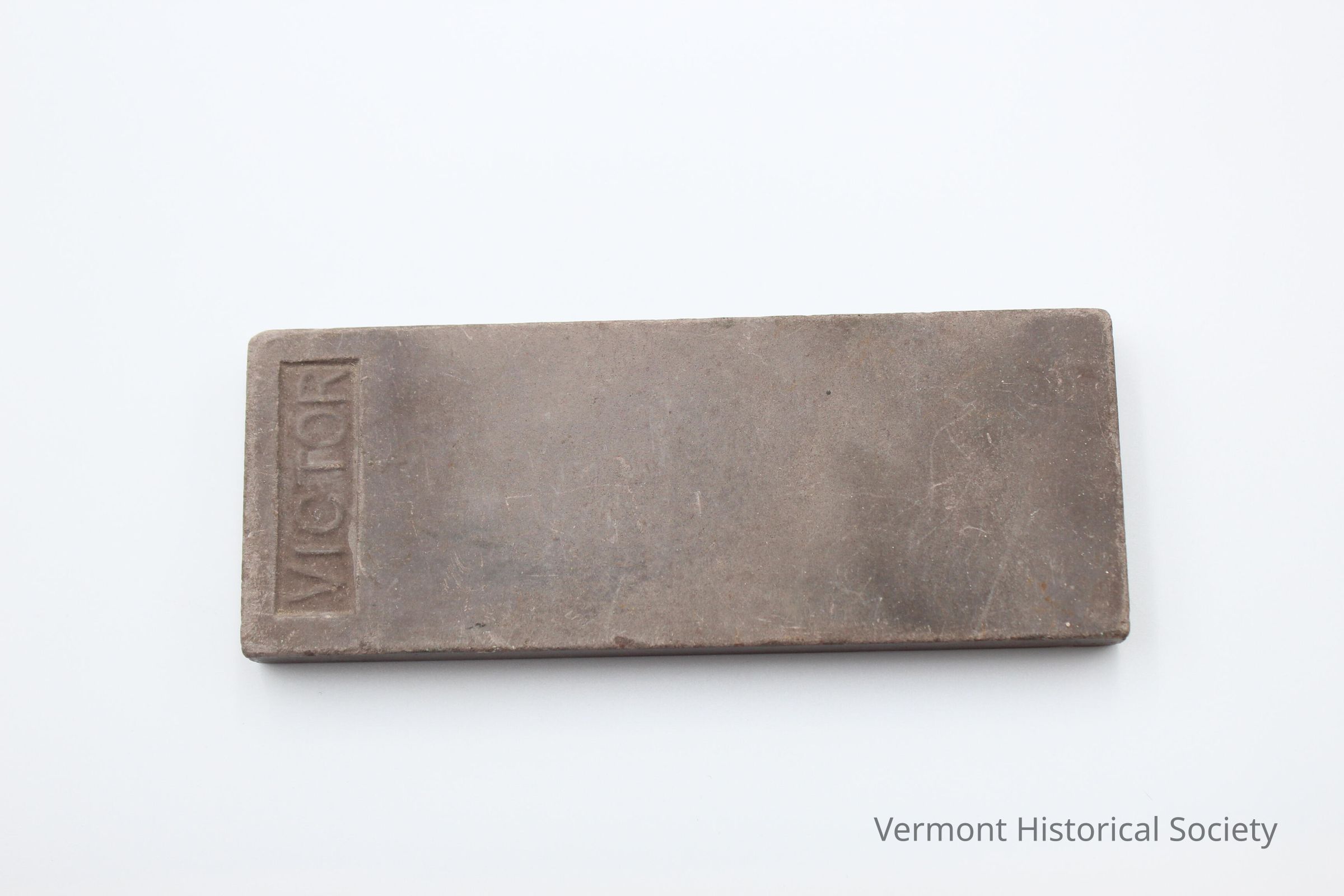 Sharpening stone, rectangular, reddish-brown tint with "Victor" carved into on one end.Context