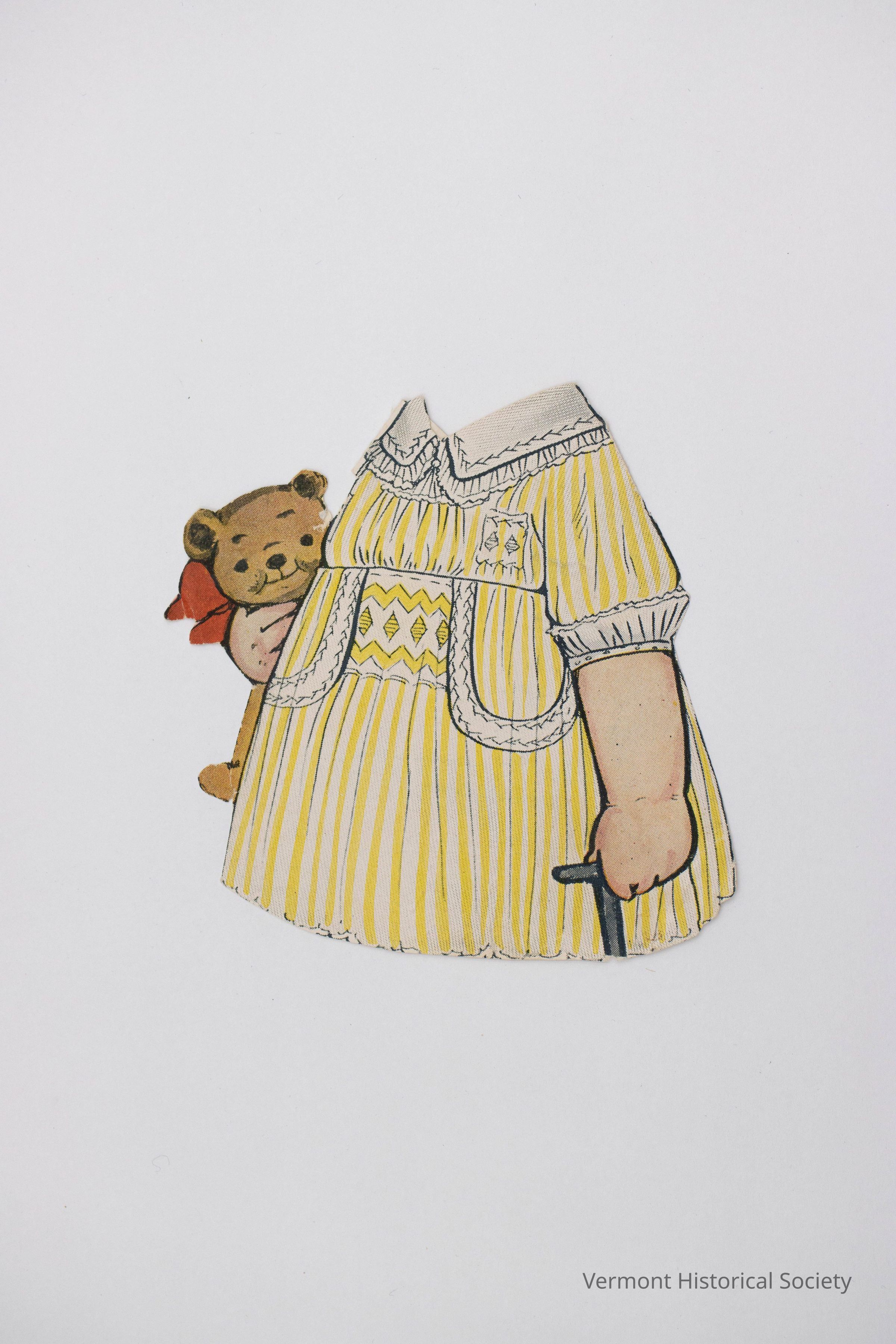 Printed paper dress for a paper doll. The dress is yellow-and-white striped with a white collar. One hand is holding the handle of a nondescript toy, and the other arm is holding a teddy bear. The back shows a portion of a sales catalog page and the handwritten label "totty".Context