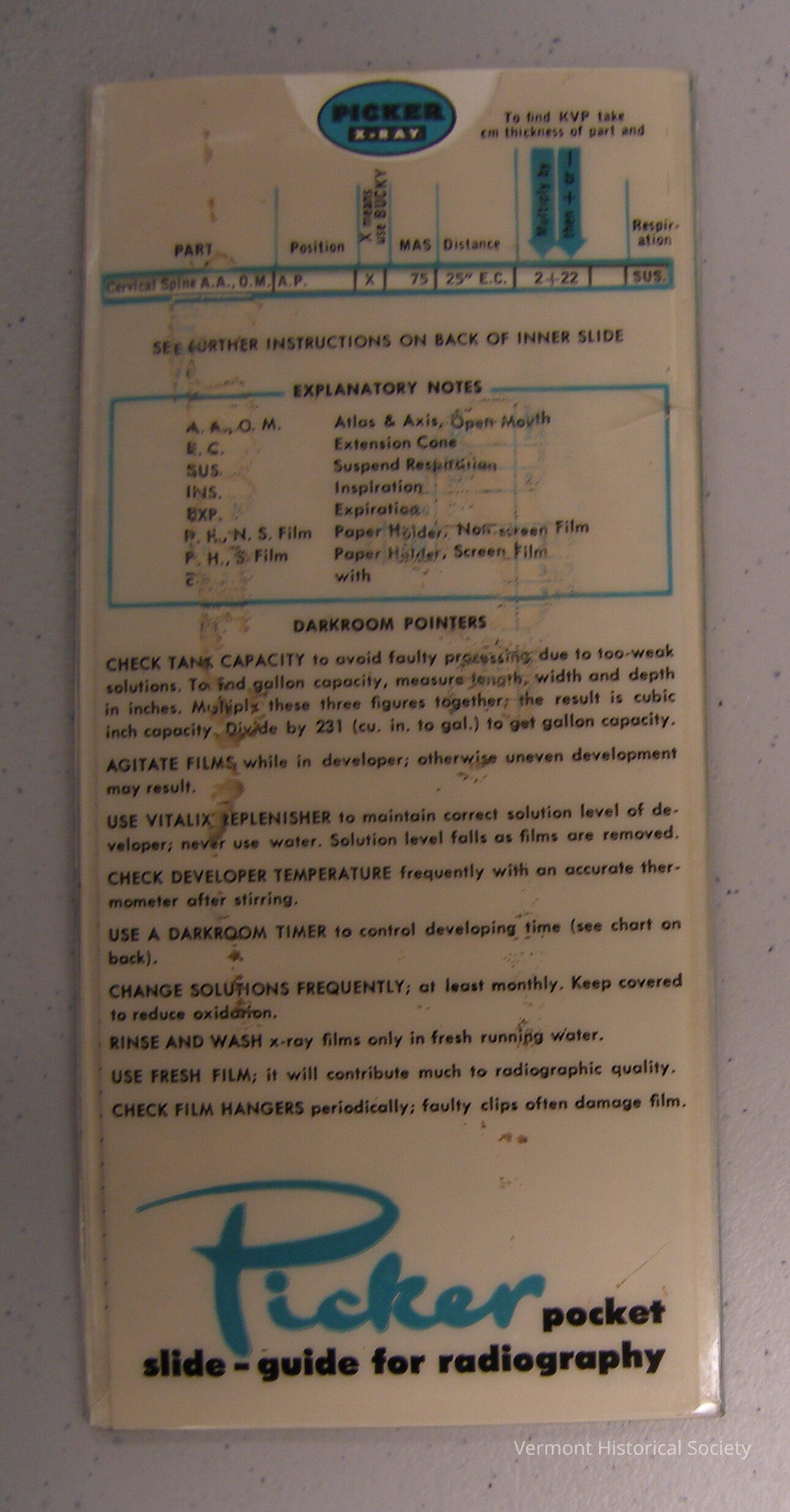 Plastic and paperboard slide rule. The slide rule is rectangular with a plastic sleeve containing a paperboard that has a white background, black lettering, and turquoise lined elements. Below the opening, a turquoise oval with a solid line black border and the words “PICKER / X-RAY.” The paperboard also has turquoise lined chart with a two rows, a section with a rectangular turquoise border labeled “EXPLANATORY NOTES” and rows of acronyms and corresponding meanings, and a final section reading “DARKROOM POINTERS” and many lines of black printed text. The bottom of the paper is the word “Picker” in large, turquoise cursive print and “pocket / slide-guide for radiography” in smaller, bolded black print.