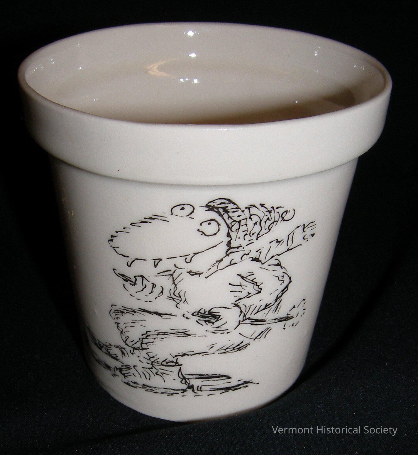 White porcelain mug in the shape of a flower pot. The mug is printed with a scribbled illustration of a long-faced beast on skis. The bottom of the cup is marked, "KOPOTS VERMONT".