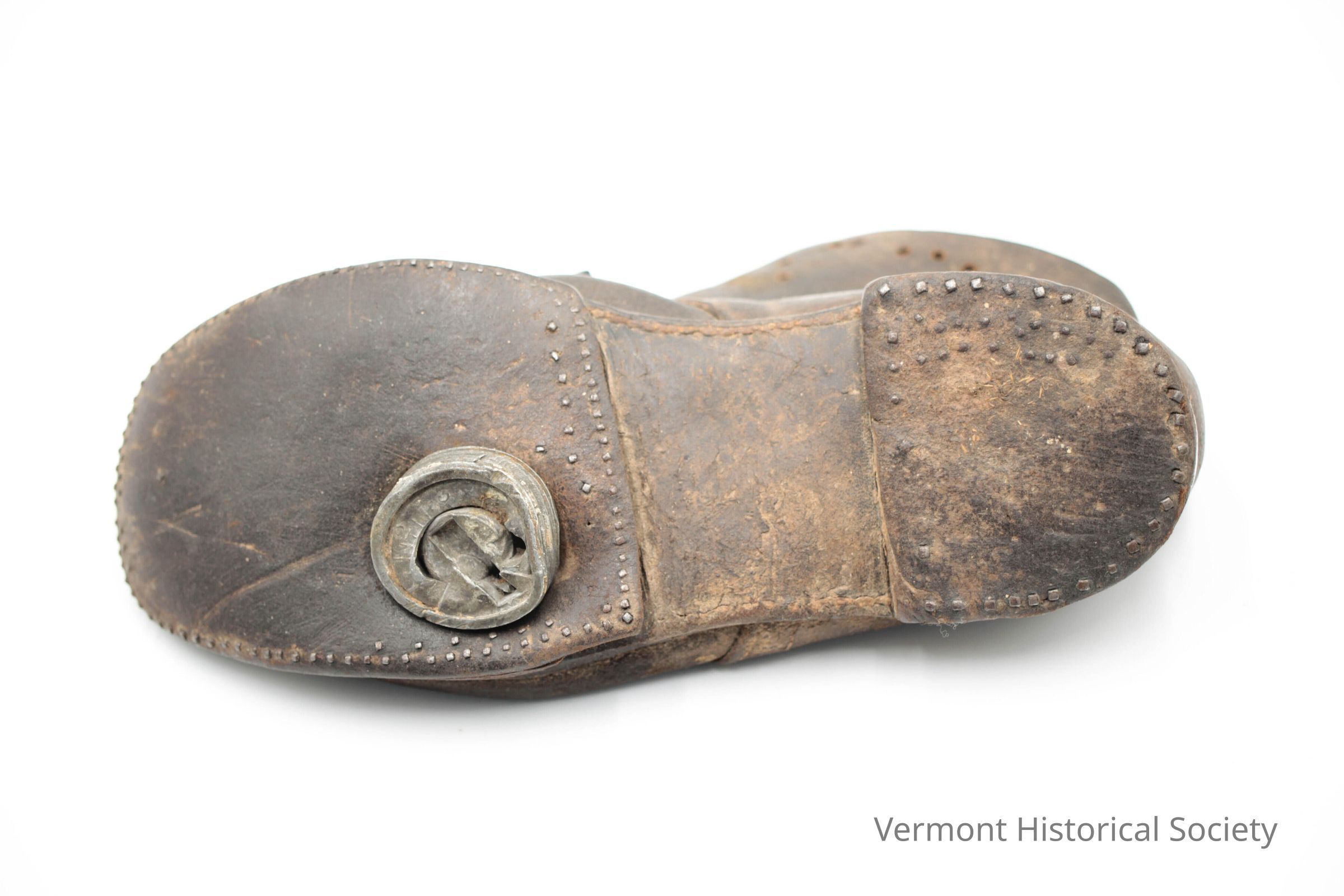 Misshapen leather shoe with large hole in the sole. The upper is formed in two parts: front and back. The sole is formed of stacked leather, the toe and heel sections held with several small tacks. There is a large circular hole in the toe portion of the sole, just beneath the ball of the wearer's foot.Context