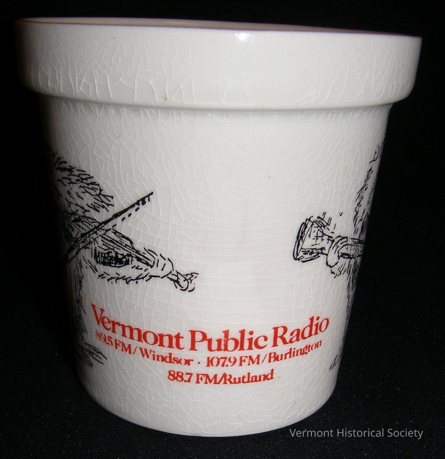 White porcelain mug in the shape of a flower pot printed with long-faced beasts playing musical instruments and the inscription, "Vermont public Radio 895FM/Windsor . 107.9FM/Burlington 88.7FM/Rutland". The bottom of the cup is marked, "KOPOTS VERMONT".