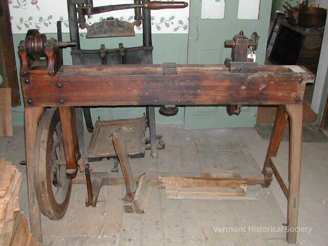 Foot-powered wood-turning lathe. The frame is entirely wood and shaped like a sawhorse. There is a large wheel beneath the frame at one side that turns with a foot treadle. A band (now missing) loops from the large wooden wheel to a small wheel bolted at the top of the frame. The small wheel is connected to a post. Another post is attached to the opposite side of the frame.Context