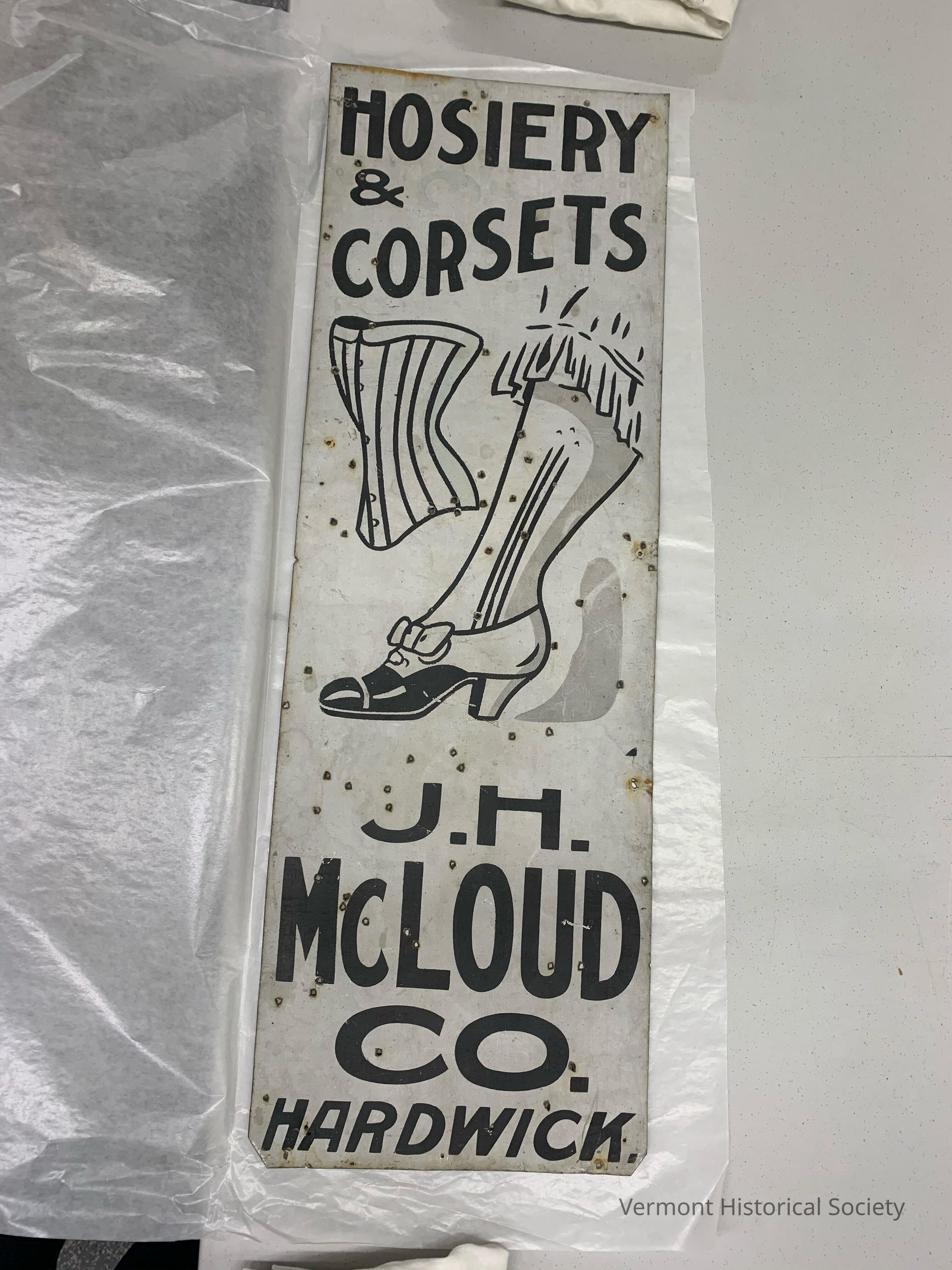 White metal sign with the inscription "HOSIERY/&/CORSETS/J.H./McLOUD/CO./HARDWICK." In the center of the sign is an illustration of late-19-century-style corset and a woman's leg wearing a high-heeled pump, stocking, and ruffled bloomer. The sign is riddled with bullet holes.