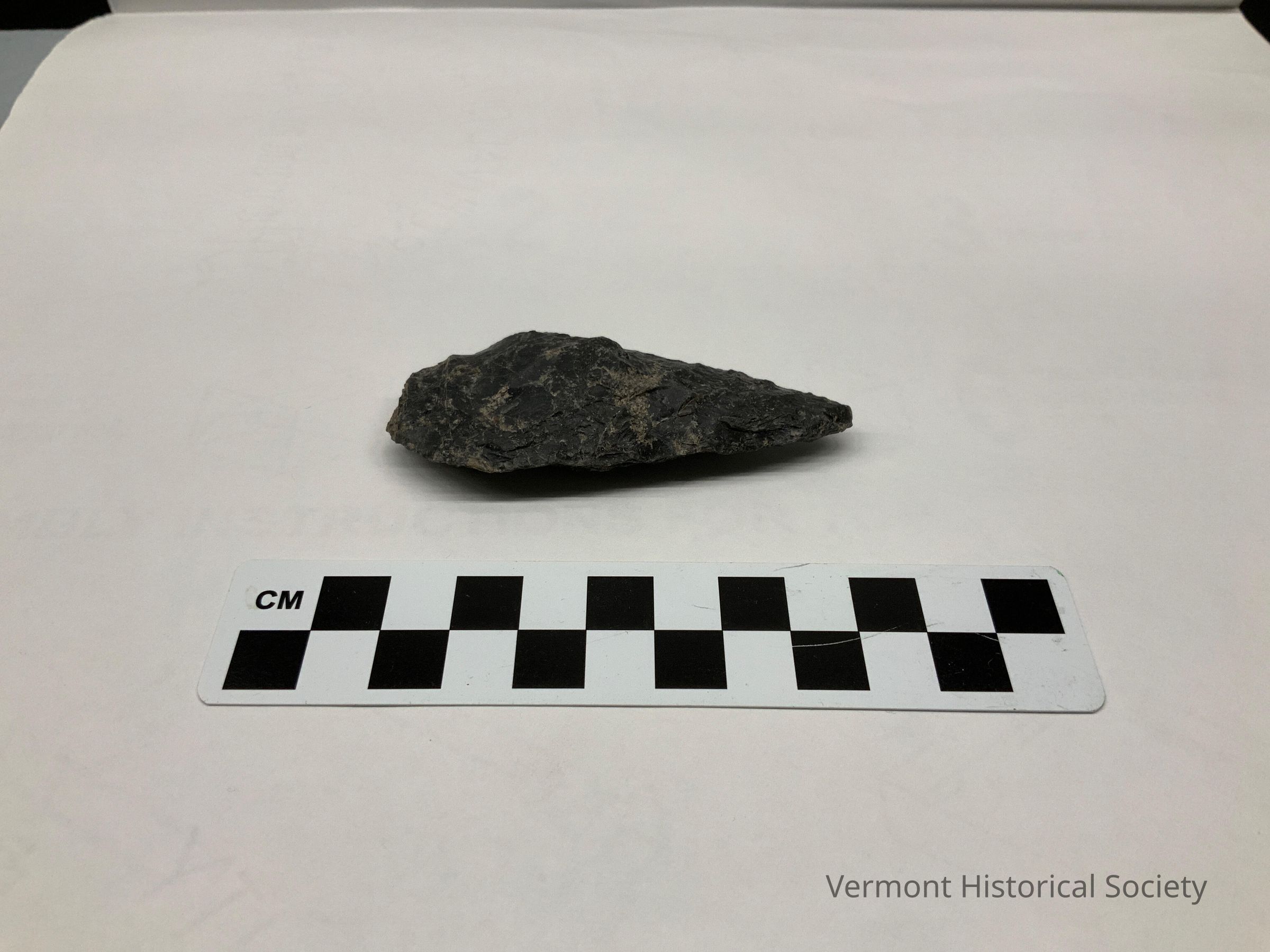 Black chipped stone projectile point. It has straight blade edges, and shoulders curve inward.Context