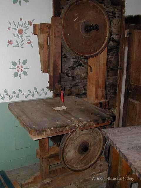 Large wooden band saw. The saw sits on a wooden base with holes to bolt to the floor. There are two wheels above and below the work table that move the band saw blade. The side is stenciled with the words, "Mfg by F. Grout, Derby, VT. Patent applied for."