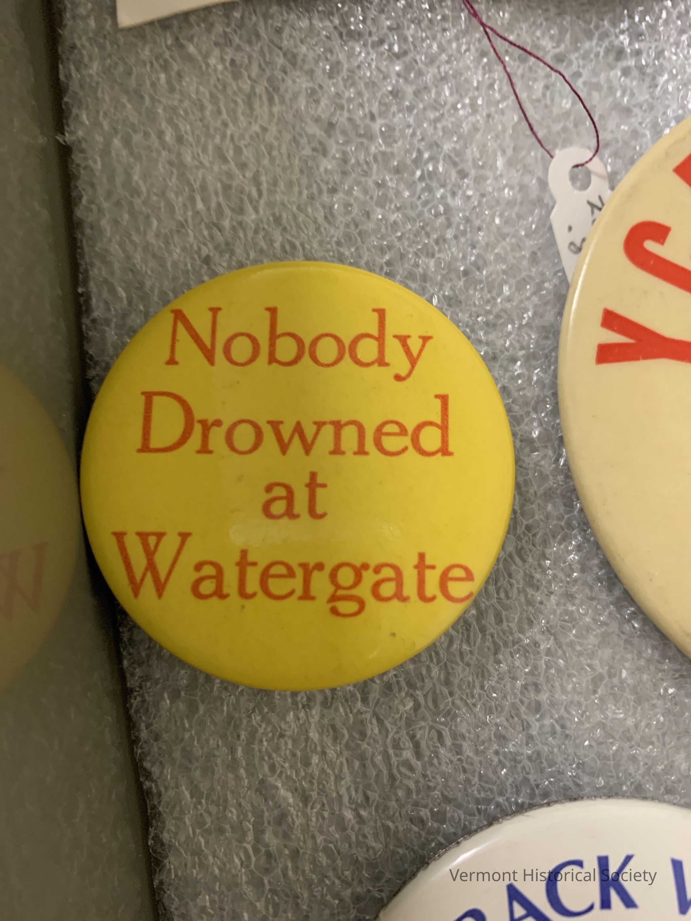 This is a political pin from 1972 election likely worn by a Vermont supporter of Republican President Richard Nixon. “Nobody drowned at Watergate” was a phrase used, especially by supporters of President Richard Nixon, to minimize the impact of the Watergate scandal and to point to scandals in the Democratic party.Acquisition