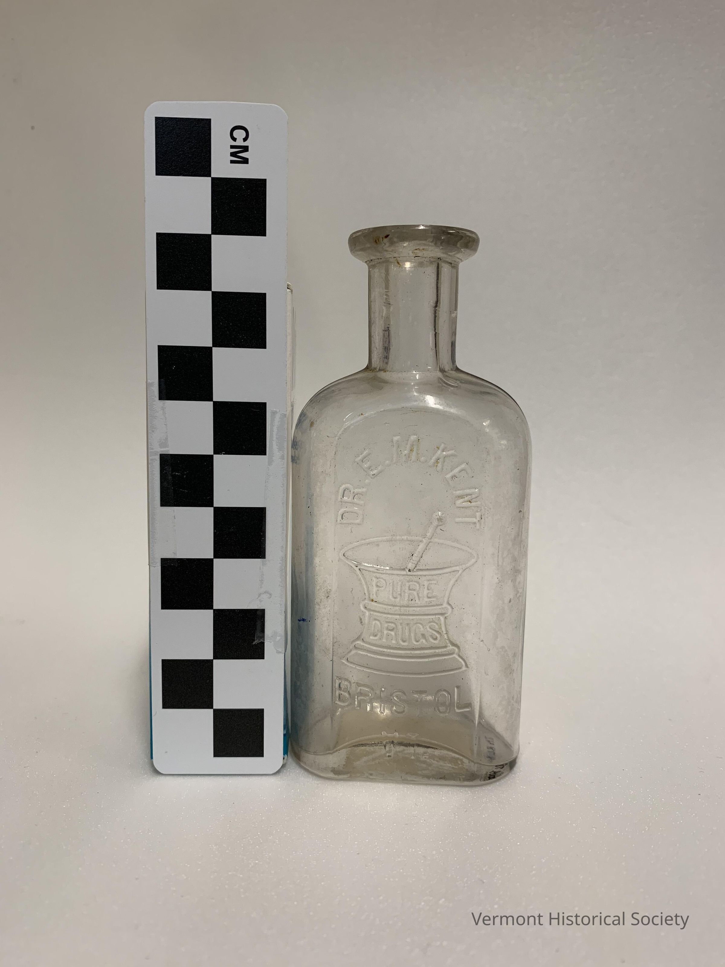 Clear, molded class bottle bearing the molded inscription, "DR. E. M. KENT/BRISTOL/VT." and the image of a mortar and pestle on which is the inscription, "PURE/DRUGS". A paper label on the base bears the inscription "3/25/72 / Sran Smith / free".