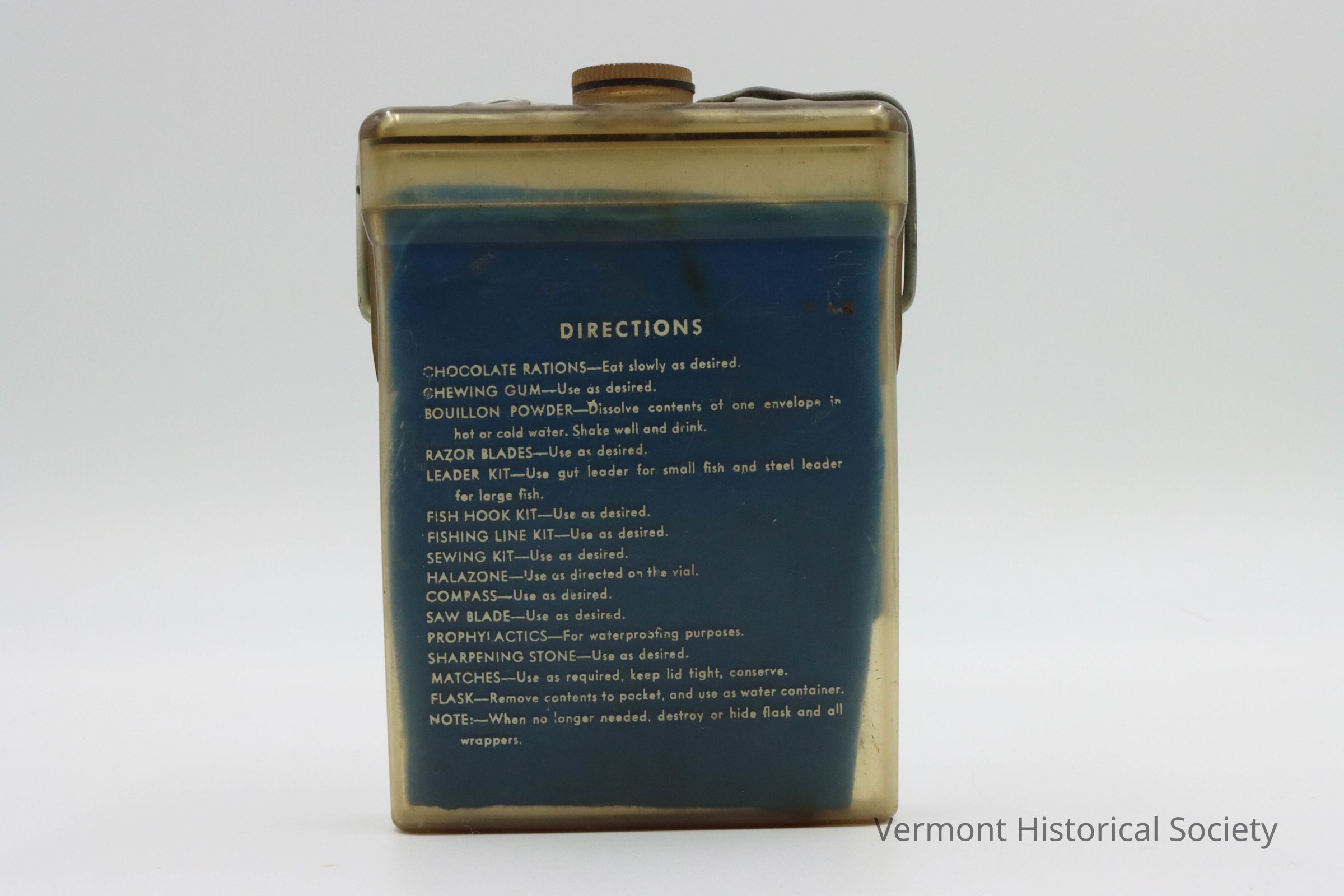 Empty, water resistent plastic container with "DIRECTIONS" printed in white on the face including: "DIRECTIONS / CHOCOLATE RATIONS - Eat slowly as desired. / CHEWING GUM - Use as desired. / BOUILLON POWDER... / RAZOR BLADES... / LEADER KIT... / FISH HOOK KIT... /...COMPASS... / SHARPENING STONE... / NOTE; - When no longer needed, destroy or hide flask and all wrappers." Rectangular with a wire bale holding on top. Smokey colored plastic.Context