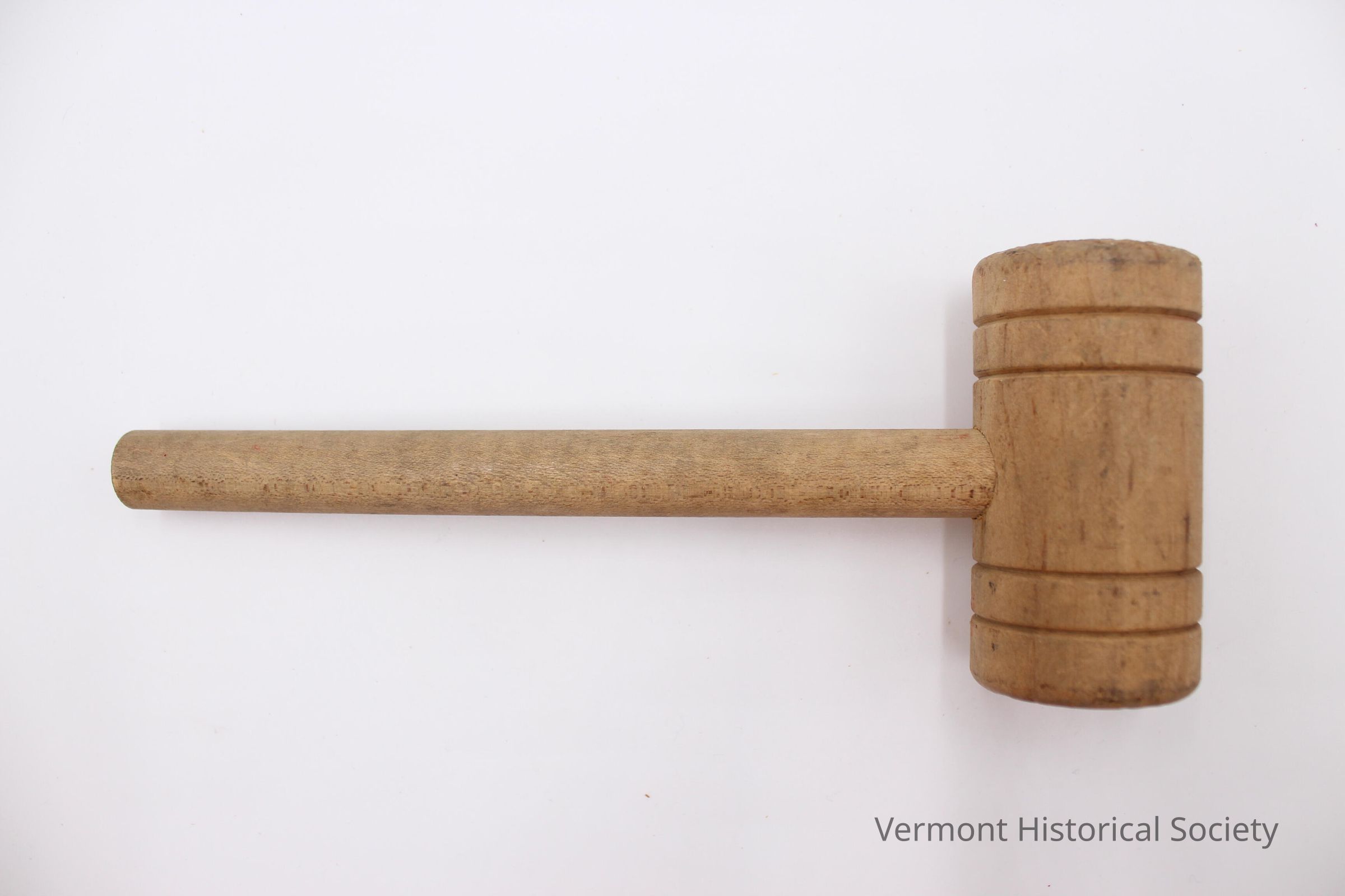 Small mallet consisting of a turned, cylindrical handle and a cylindrical head with two lines of filleting on either side.