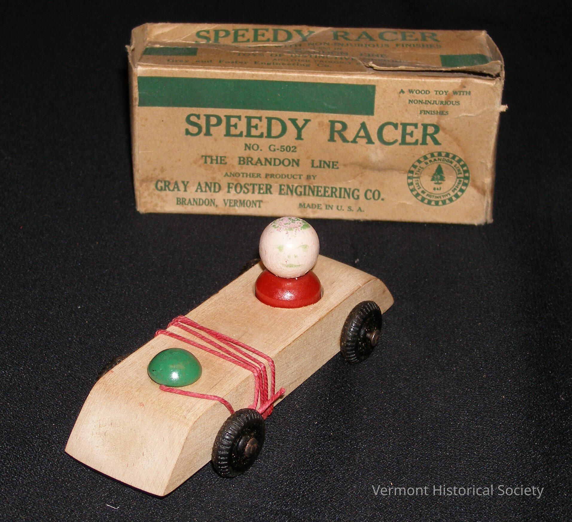 Wooden toy car with a peg person passenger. The car is a rectangular block of wood with sloped front and back. Black plastic wheels are attached with metal pins. The peg person has a pink head with green facial features and a red body, and it inserts into a drilled hole in the top of the car. There is a red string attached with a green peg to the front of the car for pulling it. The toy is with its original cardboard box that is labeled, "SPEEDY RACER".Context