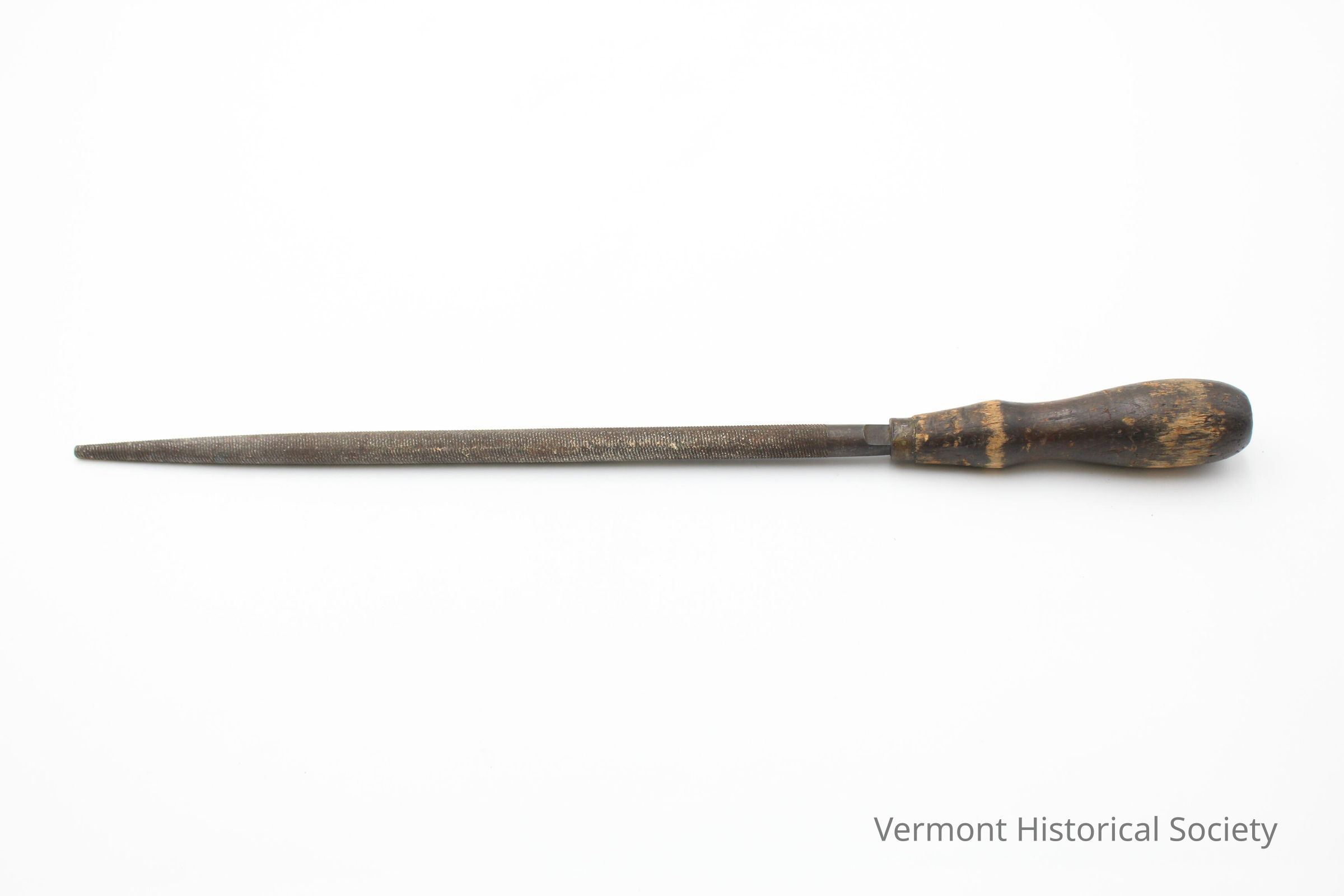 Round metal file with wood handle, metal cap into which tang is inserteg; tapered point; handle is tapered in center for a better grip; no manufacturing markContext
