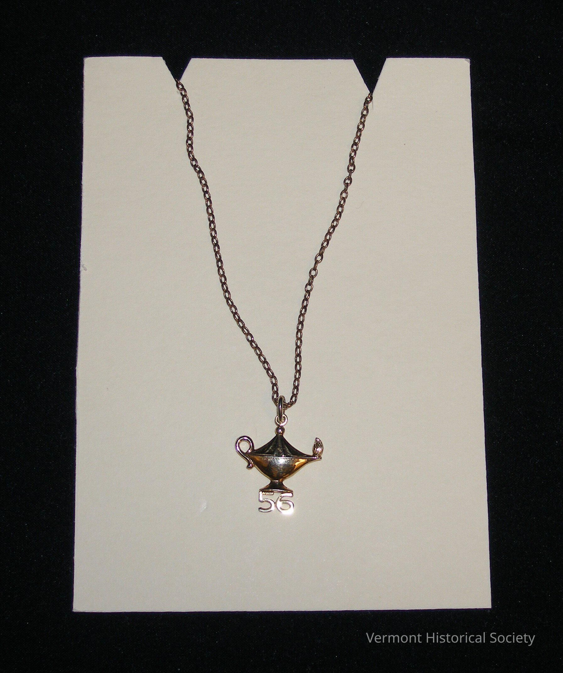 Gold chain necklace with a pendant in the shape of an oil lamp (a "lamp of learning") with the number 56 at the bottom.